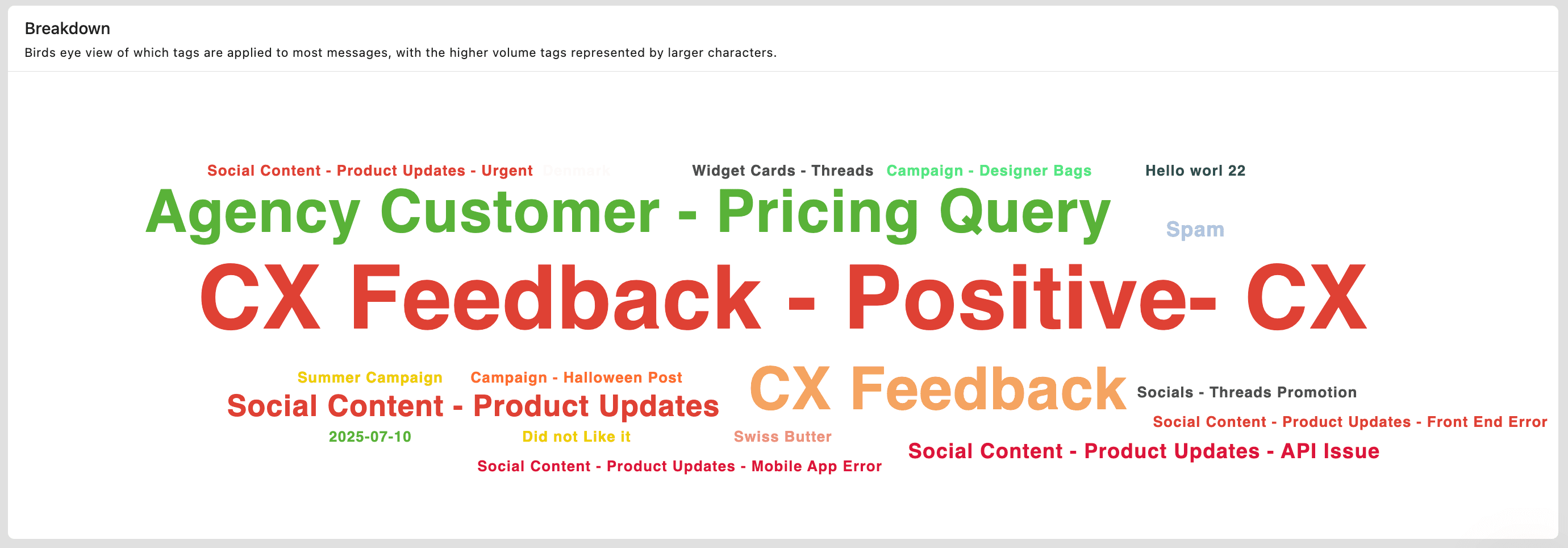 ブレークダウンウィジェット は、どのタグが会話に最も多く適用されているかを俯瞰的に視覚化します。メッセージ数の多いタグは大きく太い文字で、使用頻度の低いタグは小さく表示されます。