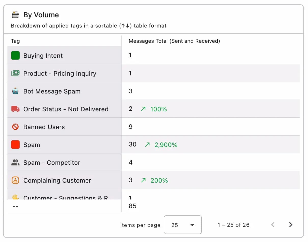 ボリューム別ウィジェット は、タグ付き会話をソート可能なテーブル形式で表示し、各タグに関連するメッセージの総数を示します。メッセージ数とあわせて、前のレポート期間との比較における増減率も確認でき、各タグの使用状況の推移を追跡できます。