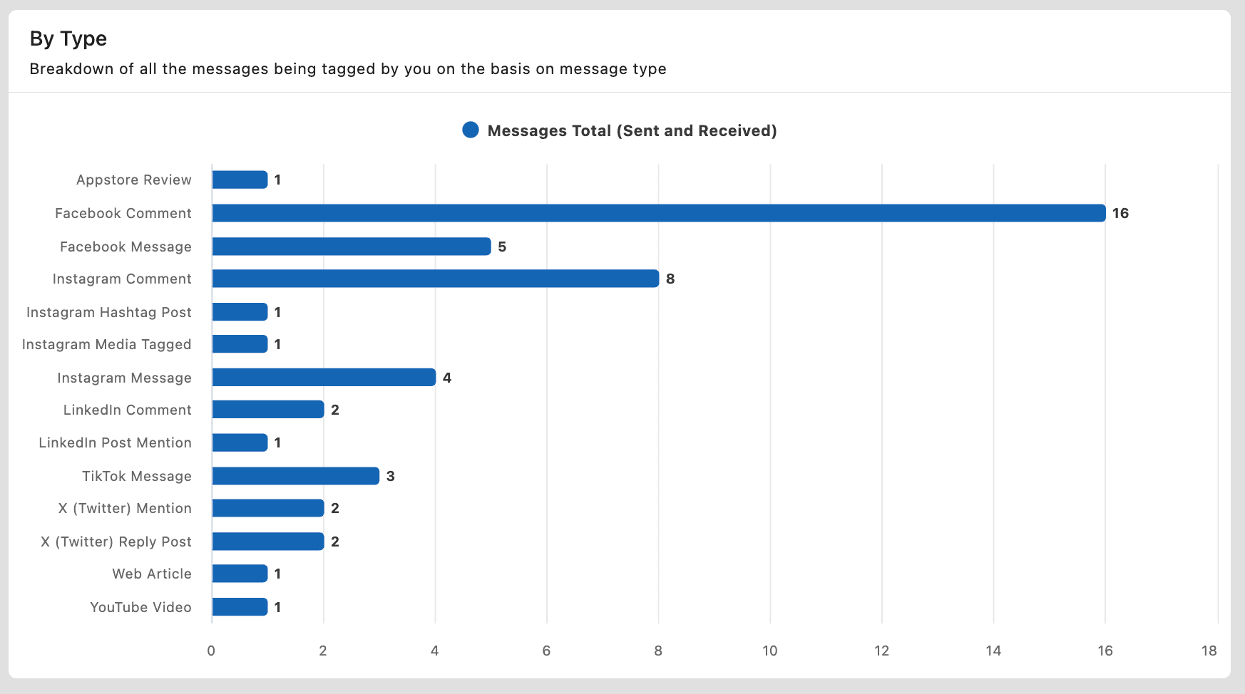 タイプ別ウィジェット は、タグ付き会話をメッセージ形式別(Facebookコメント、Instagramメッセージ、TikTokメッセージ、LinkedInコメント、Webアーティクル、YouTube動画など)に分類します。各バーはそのタイプのタグ付き会話の数を表します。