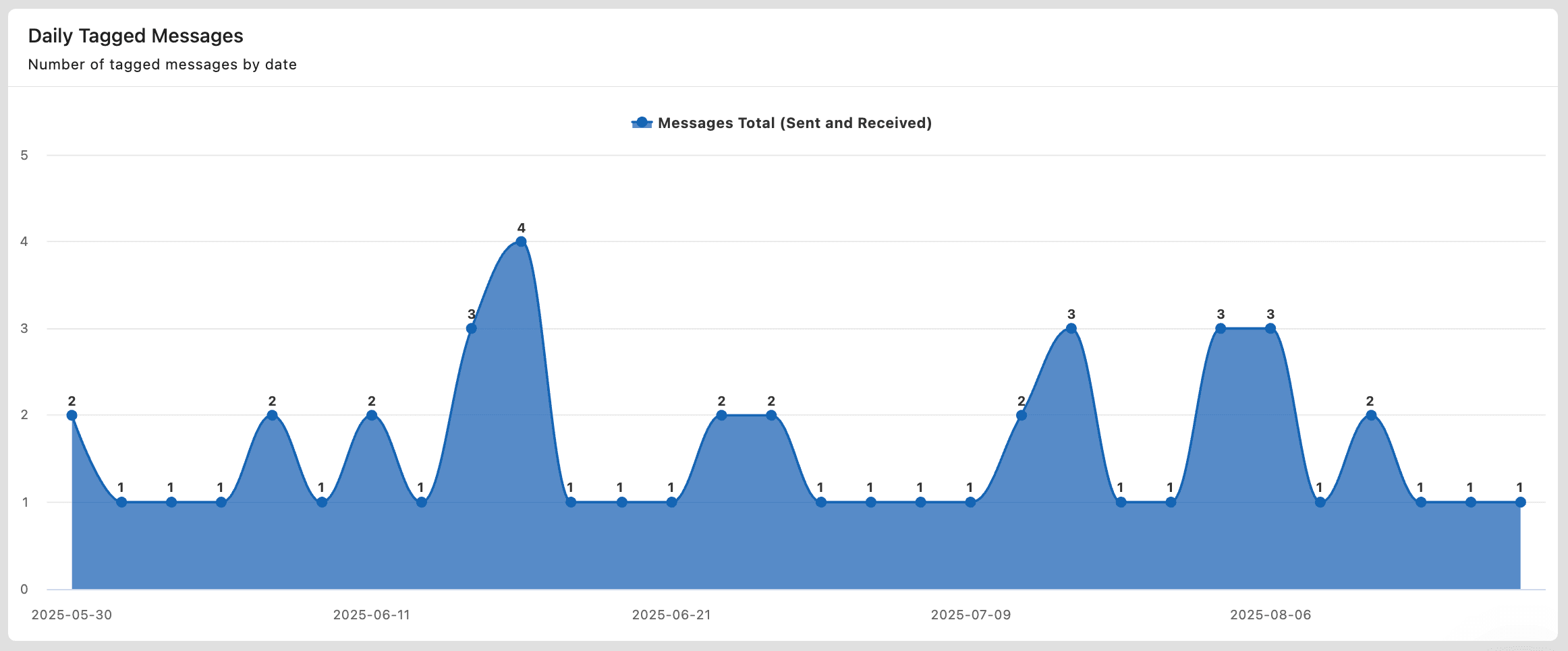 日別タグ付きメッセージウィジェット は、タグ付き会話の数を日付別に追跡し、レポート期間全体のタグ付けアクティビティをタイムラインで表示します。グラフの各ポイントは、その日にタグが付いた送受信会話の合計数を表します。