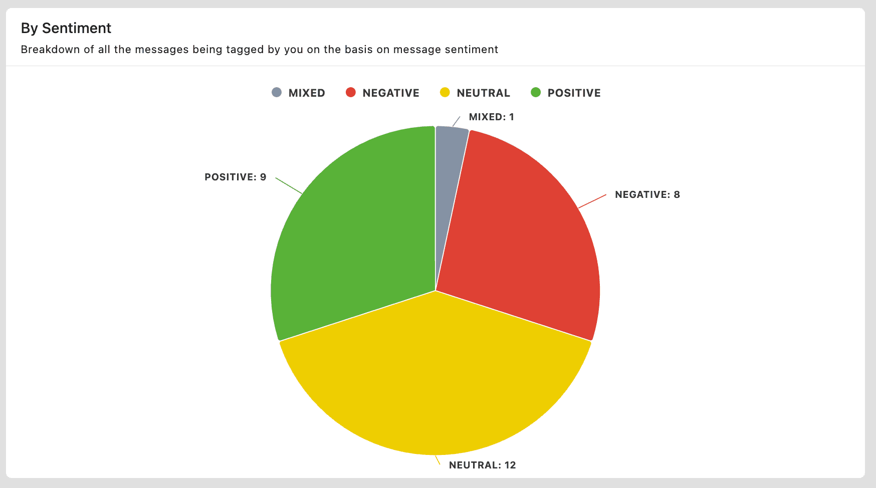 センチメント別ウィジェット は、タグ付き会話を ポジティブ・ニュートラル・ネガティブ・混合 のセンチメントに分類します。円グラフによる視覚化で、オーディエンス全体のセンチメントや時間的な変化をすばやく把握できます。