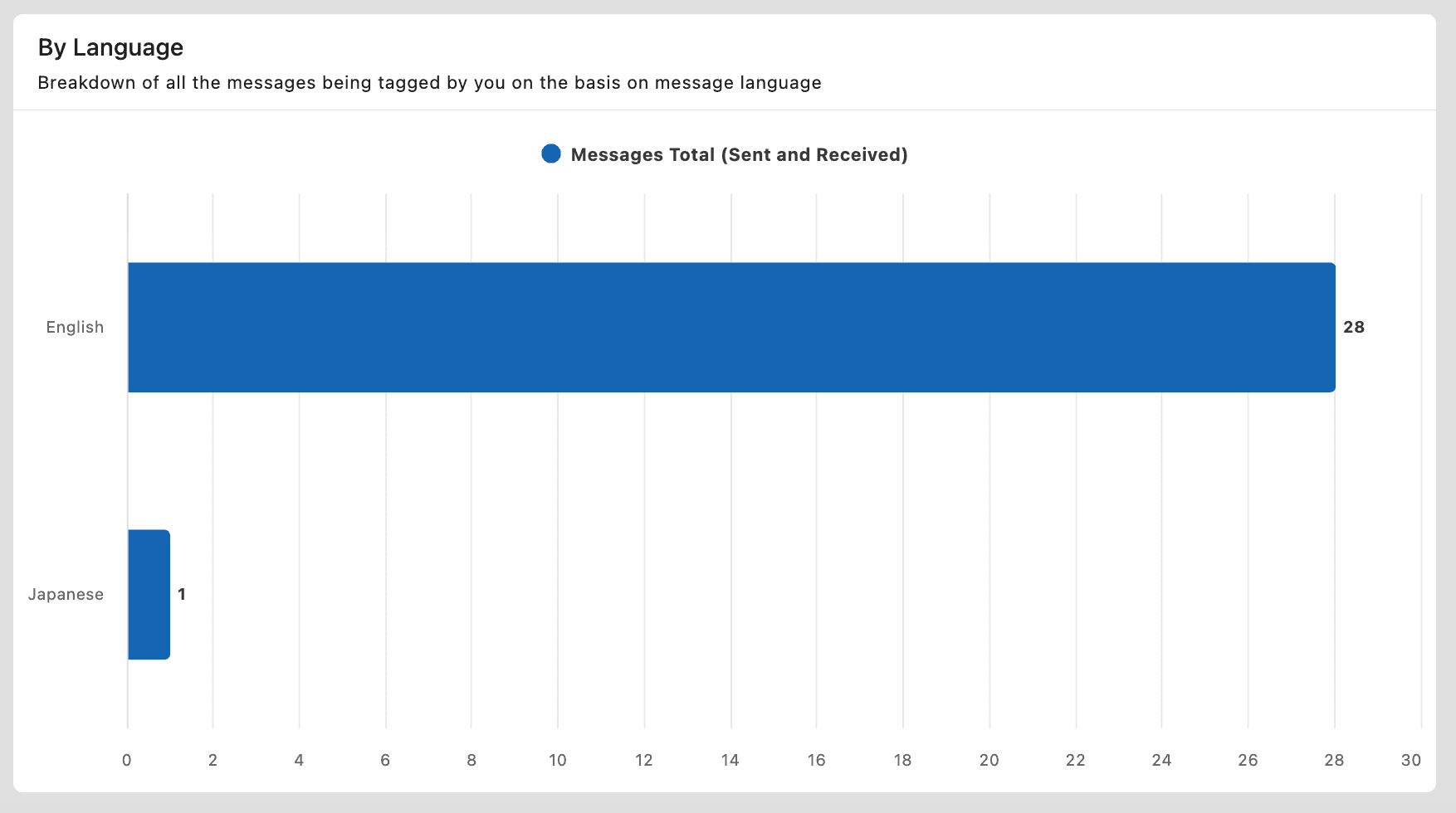 言語別ウィジェット は、タグ付き会話をメッセージの言語別に分類します。棒グラフには、接続済みプロフィール全体で各言語のタグ付き会話の総数が表示されます。