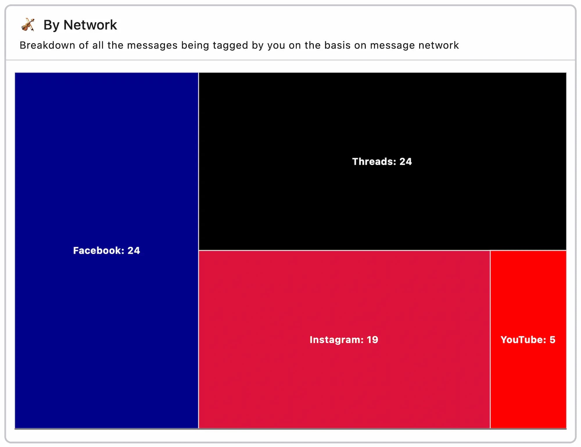 ネットワーク別ウィジェット は、タグ付き会話をソーシャルネットワークやチャンネル別(Facebook、Instagram、LinkedIn、X、TikTok、App Storeなど)に分類します。ビジュアライゼーションにはツリーマップが使用され、各ブロックのサイズがそのネットワークからのタグ付きメッセージの総数を表します。