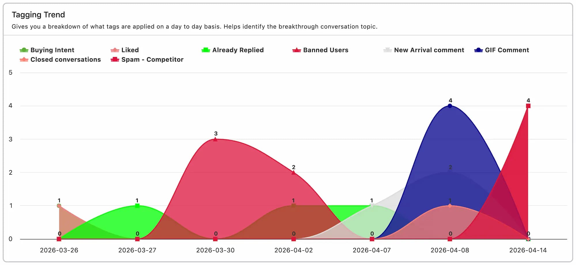 この整理されたビューは、最も頻繁に使用されているタグの詳細確認、会話トレンドの把握、そしてどのトピックがオーディエンスとの関連性を増減させているかを理解するのに特に役立ちます。たとえば「CXフィードバック」タグの増加は顧客体験への関与の高まりを示し、「製品バグ」タグの減少はユーザーの問題が少なくなっていることを示します