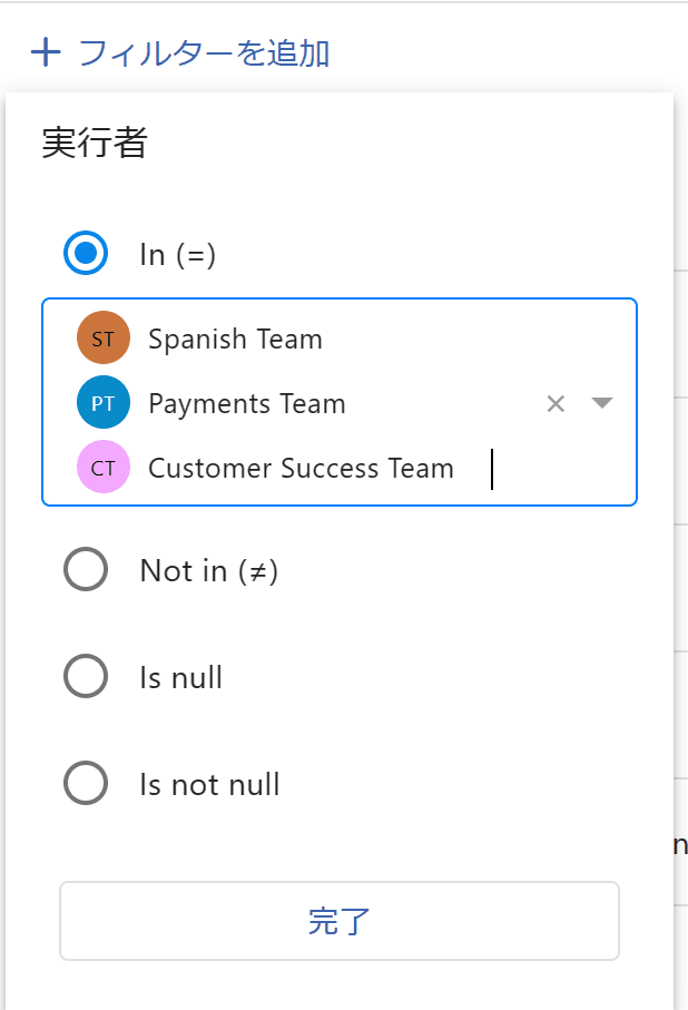 もし複数の地域でチームを管理しているのなら、地域ごとに複数のユーザーグループを作り、それに応じてフィルターを付けることができます。 日本チームのアクティビティを確認するためにJP Teamという実行者を追加することができます。