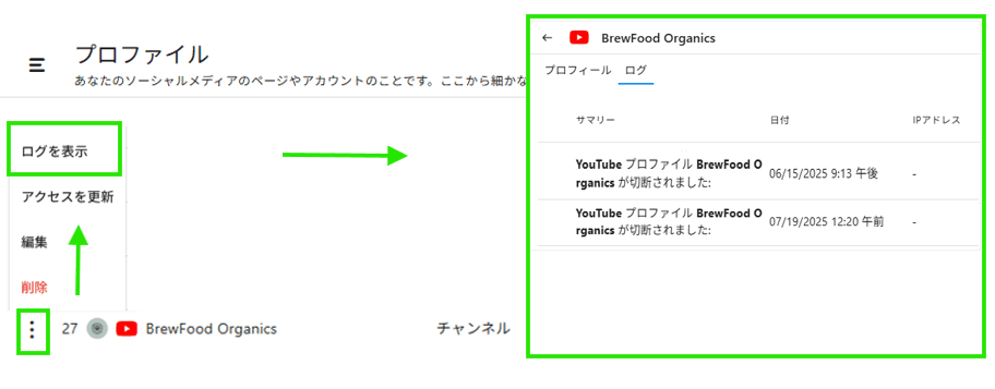各プロファイルの左端の三点メニューをクリックし、「ログを表示」を選択します。