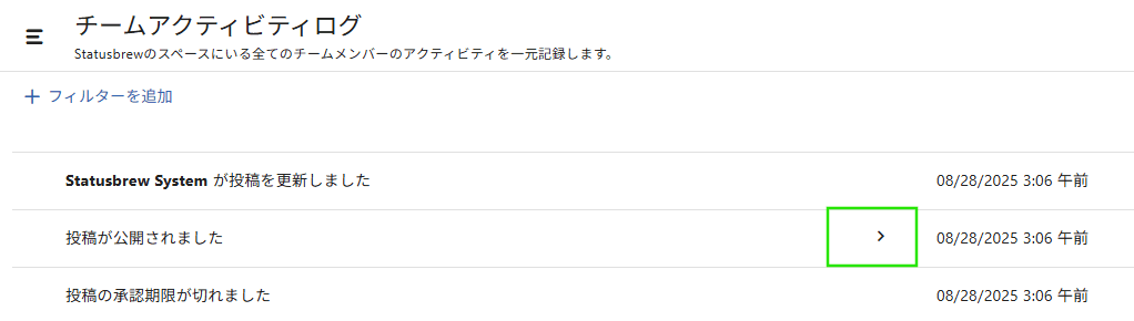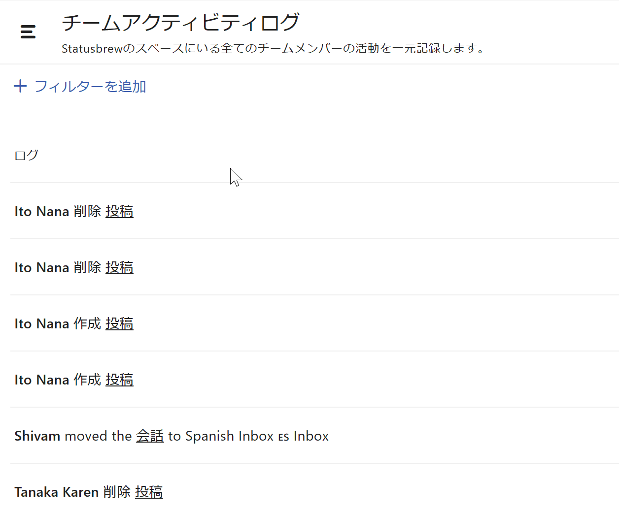 組織のメンバーがStatusbrewをアクティブに使用している場合、チームアクティビティログはリアルタイムで更新され、どのチームメンバーがどのアクションをいつ実行したかなどの情報が表示されます。