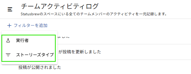 チームアクティビティログに実行者やストーリーズタイプというフィルターを付けることができます。