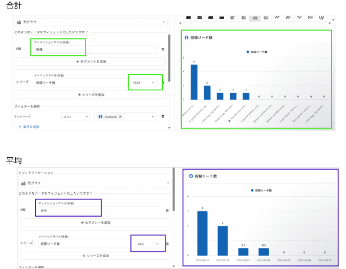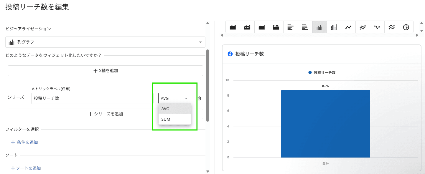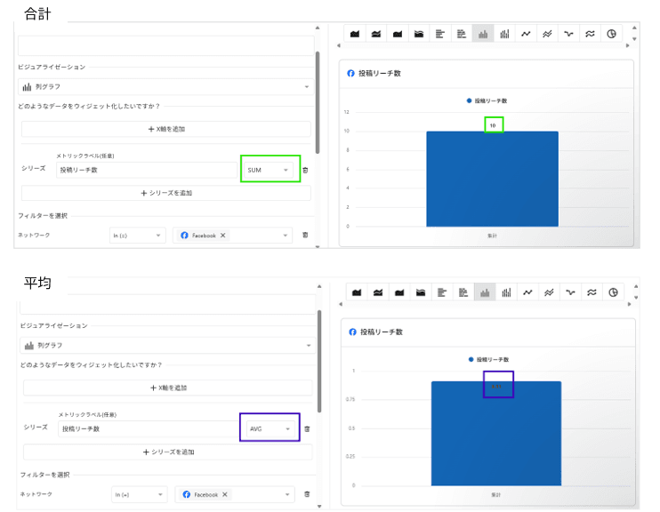 合計値または平均値が選べるもの(SUM/AVG):例)投稿リーチ数