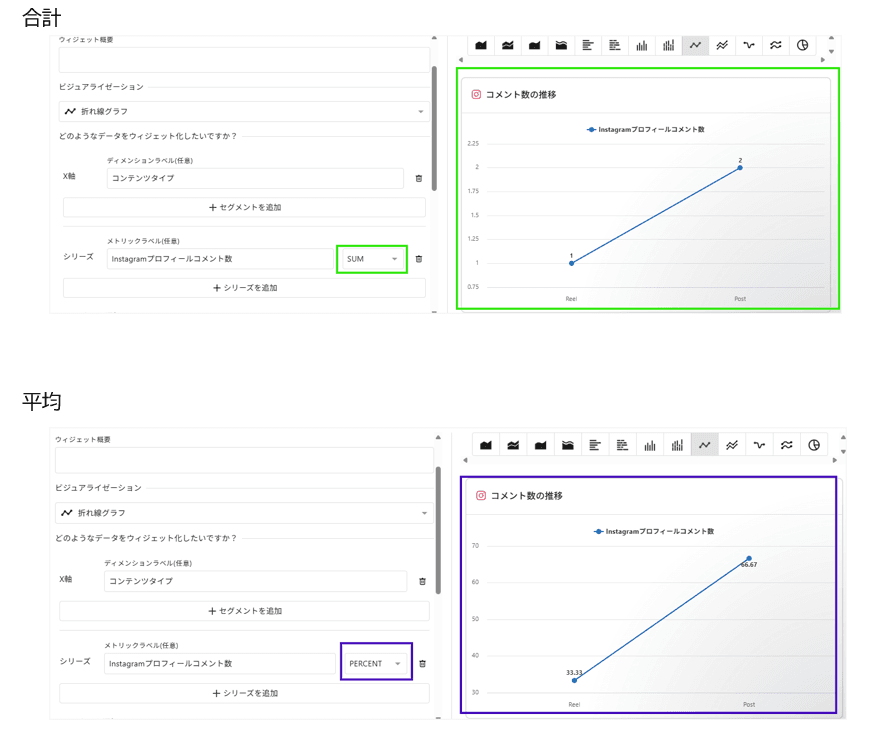 ここでは、割合または合計を選択できる「Instagramプロフィールコメント数」を例に考えてみましょう。