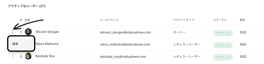 もし、ユーザーをアーカイブしようとする際に、編集メニューにつながる3点ドットメニューが見当たらない場合、ユーザーの権限があなたと同等のオーナーか、さらには最上位権限であるプライマリーオーナーとして存在するためです。
