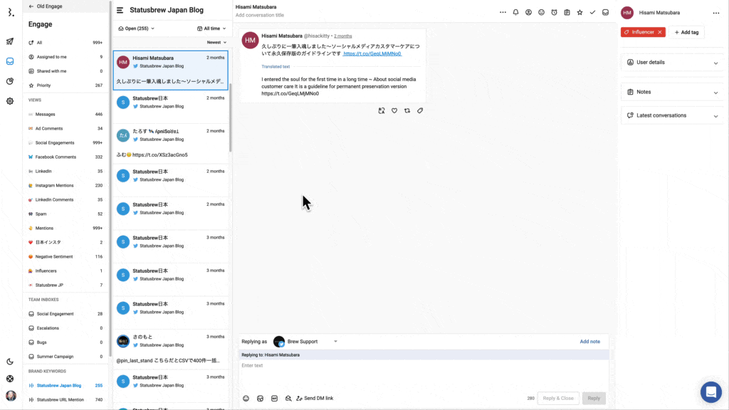 Statusbrewでは、ブランドにとって重要なソーシャルでの会話を監視する高機能なソリューションを提供しています。 リスニング機能は、あなたのブランドのキーワードを含む全ての会話を取得するすることができます。これらの会話は一つのストリームで簡単に表示することができます。Statusbrewのエンゲージ内から直接これらの会話に返信やエンゲージすることができます。