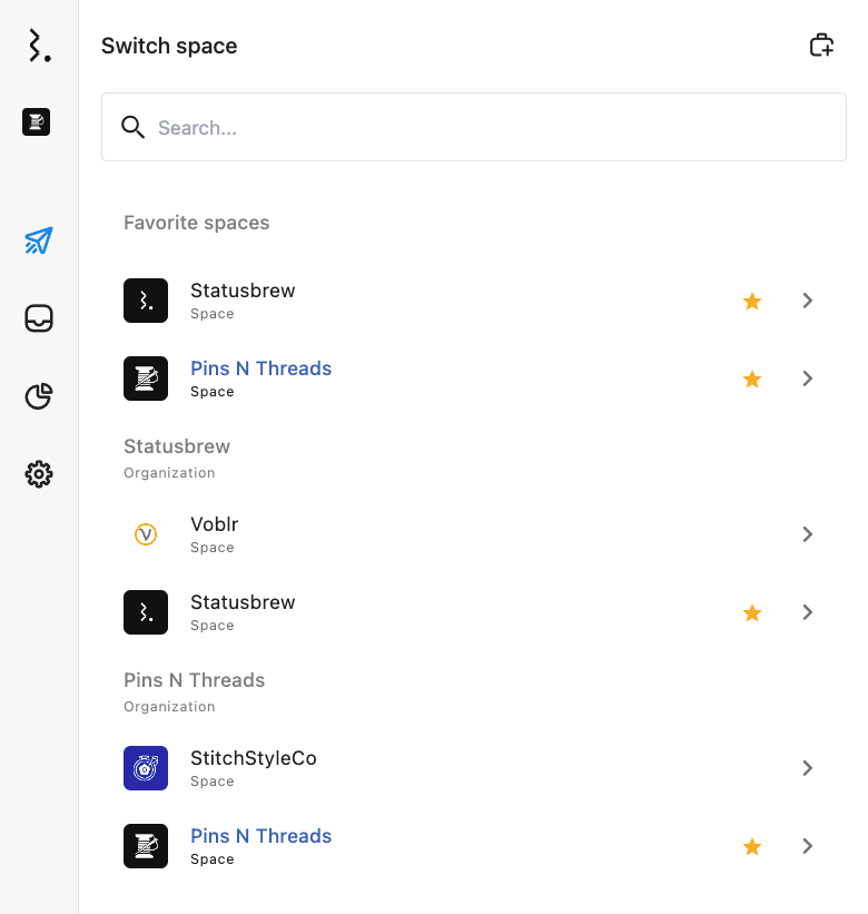 Statusbrewに初めてサインアップすると、デフォルトで新しい組織(と同名のワークスペース)が作成され、アカウント全体で共有されます。その後、必要に応じて新しいスペースを作成し、部署やチーム、あるいはクライアントをまとめることができます。