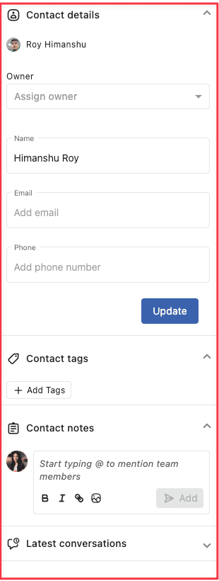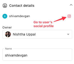 このセクションでは、名前、メールアドレス、電話番号などの連絡先に関連する詳細を追加することができます。また、コラボレーションを向上させるために、連絡先にオーナーを割り当てることもできます。Facebook、Instagram、Twitter(X)の場合、連絡先の横のネットワークアイコンをクリックすると、ユーザーのソーシャルプロファイルに直接移動します。
