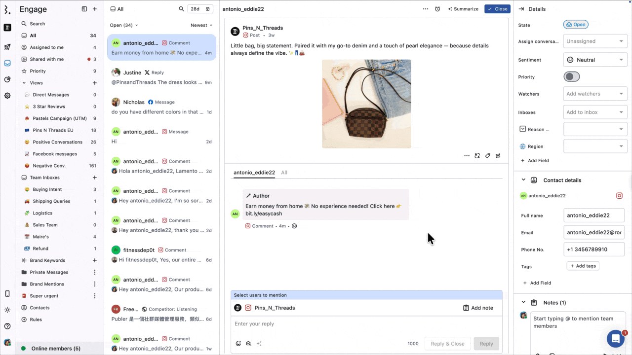 例えば、VIP顧客、インフルエンサー、リード、サポートエスカレーションといったタグに基づいて分類できます。 こうした細分化により、返信の優先度や、各グループにふさわしいエンゲージメント戦略が簡単に分かります。