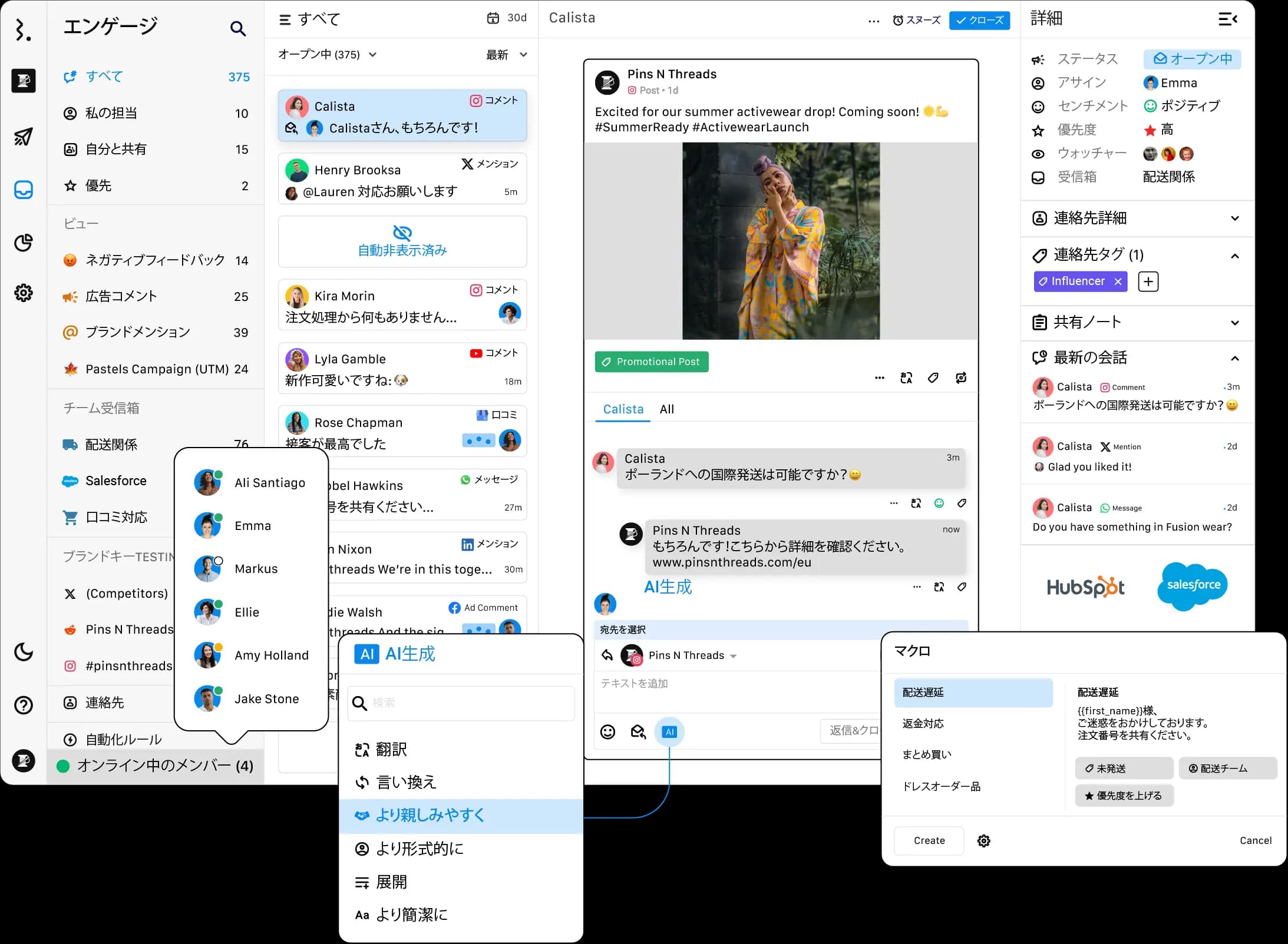 会話を見逃さない – コメントやDM、レビュー、メンションといったすべてのSNS上のやりとりを1つの受信箱で管理し、リアルタイムで返信することができます。