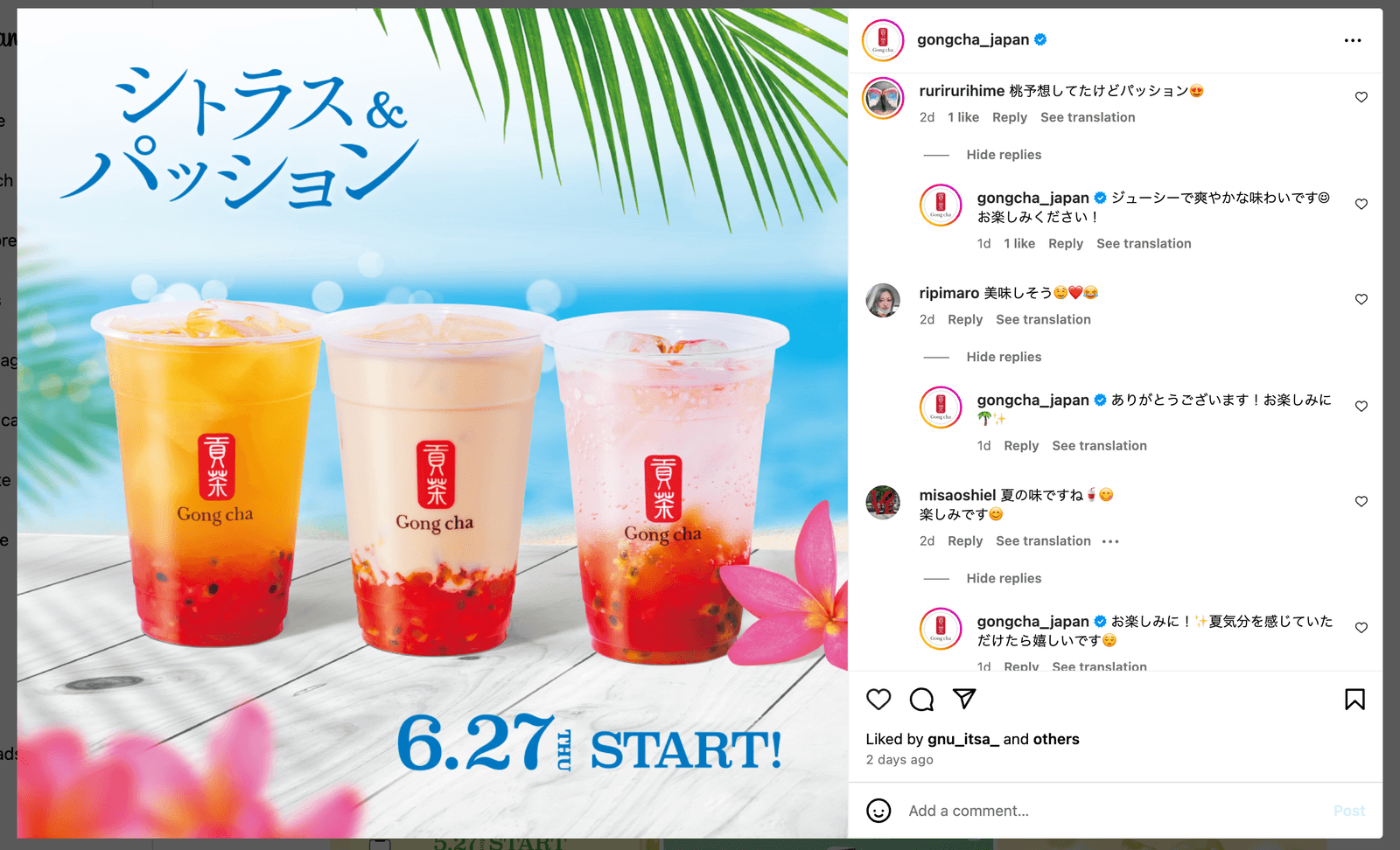 フォロワー数10万人〜の ティーカフェブランド GonchaのInstagramアカウント