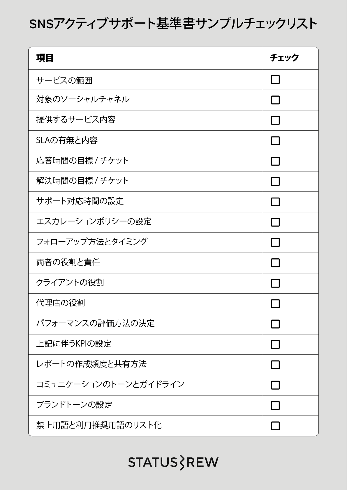 最後に、ソーシャルメディアのアクティブサポートをクライアントの代行として行う場合、ヒアリング時〜契約時の基準書を作成する際に欠かせないポイントをチェックリストにまとめました。