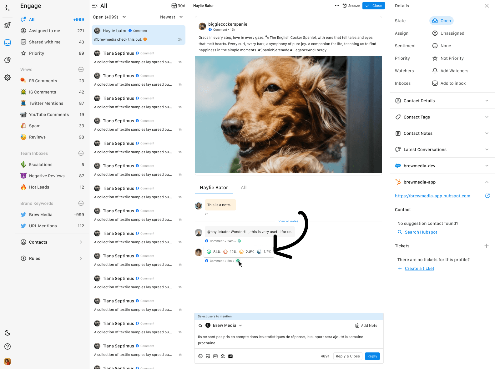 ツールを選定し、クライアントから許可されたSNSアカウントを接続すると、このように数分で直近のコメントやDMなど全てのエンゲージメントが一気に同期され、チケットとして返還されます。