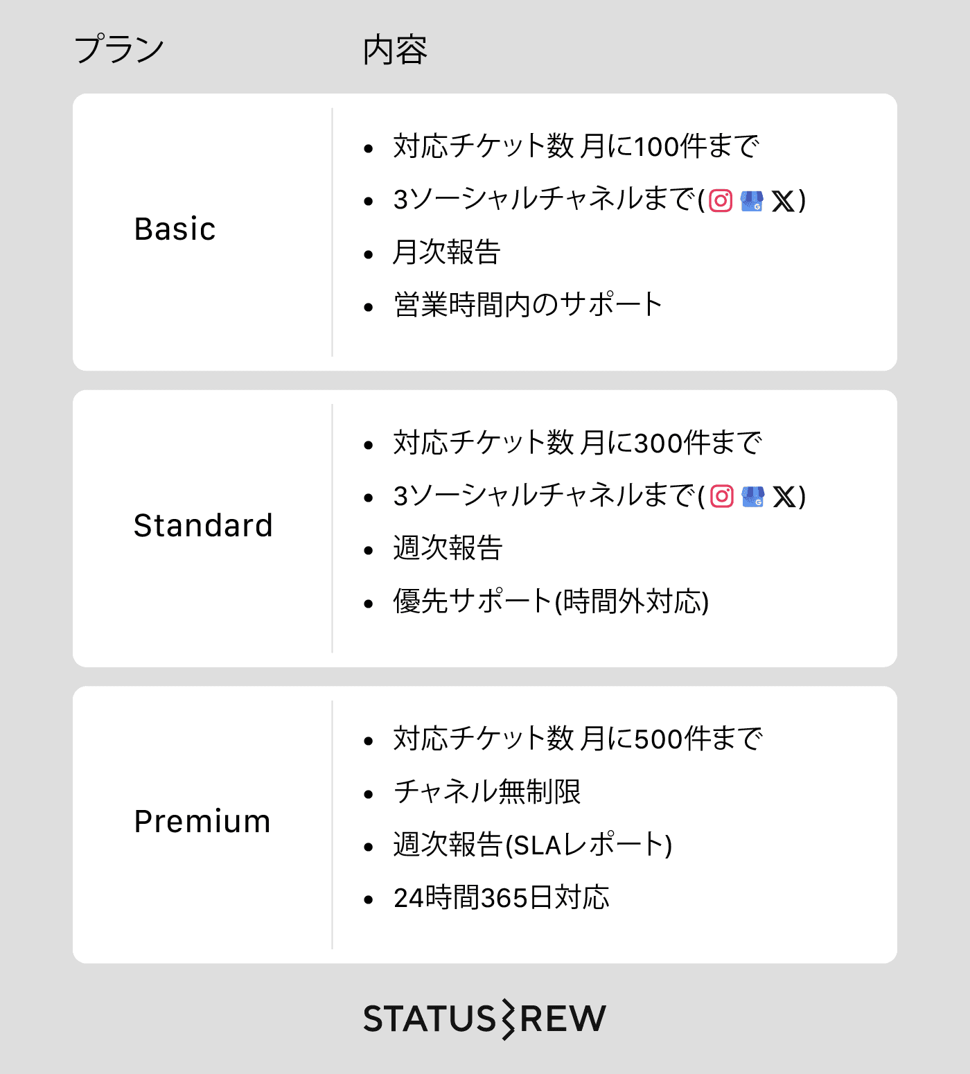下に、サンプルでプランを作成してみました。事業の規模に合わせたチケット数や、報告の頻度、対応するソーシャルチャネルの数、またサポートは1日中対応するのか、限られた時間で対応するのかを含めてみました。