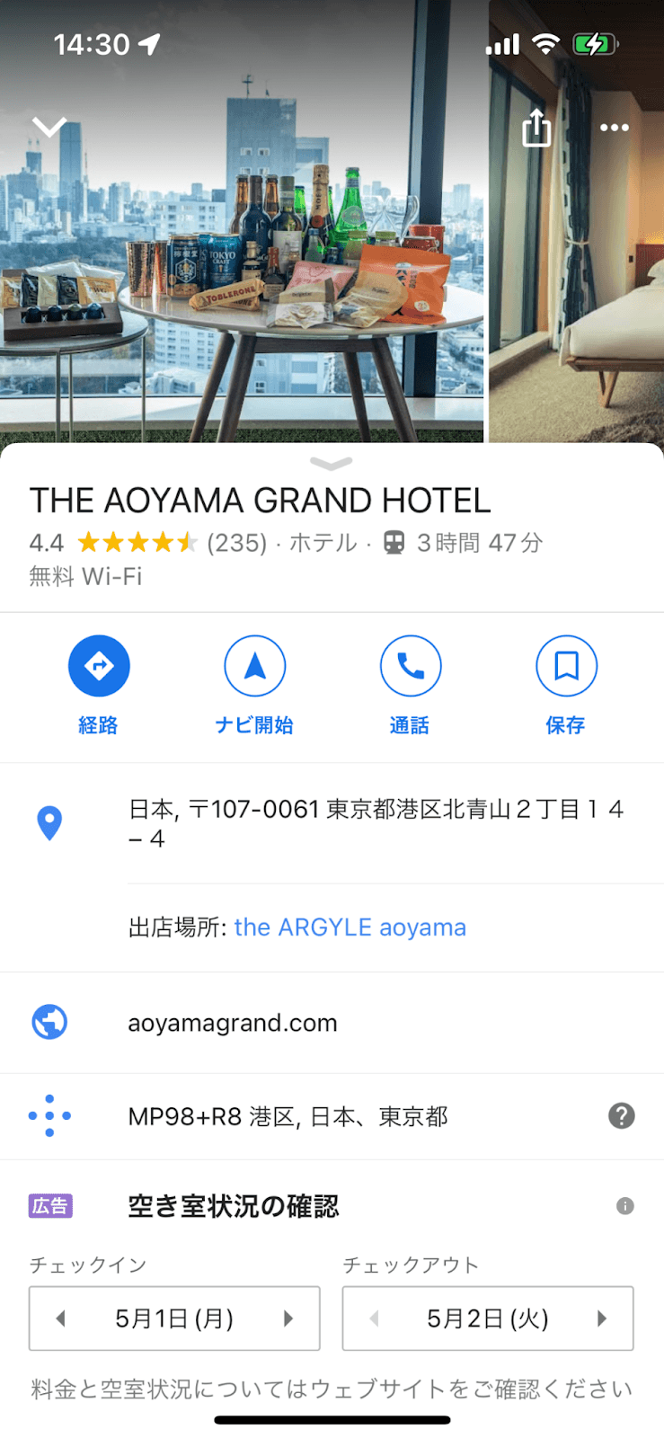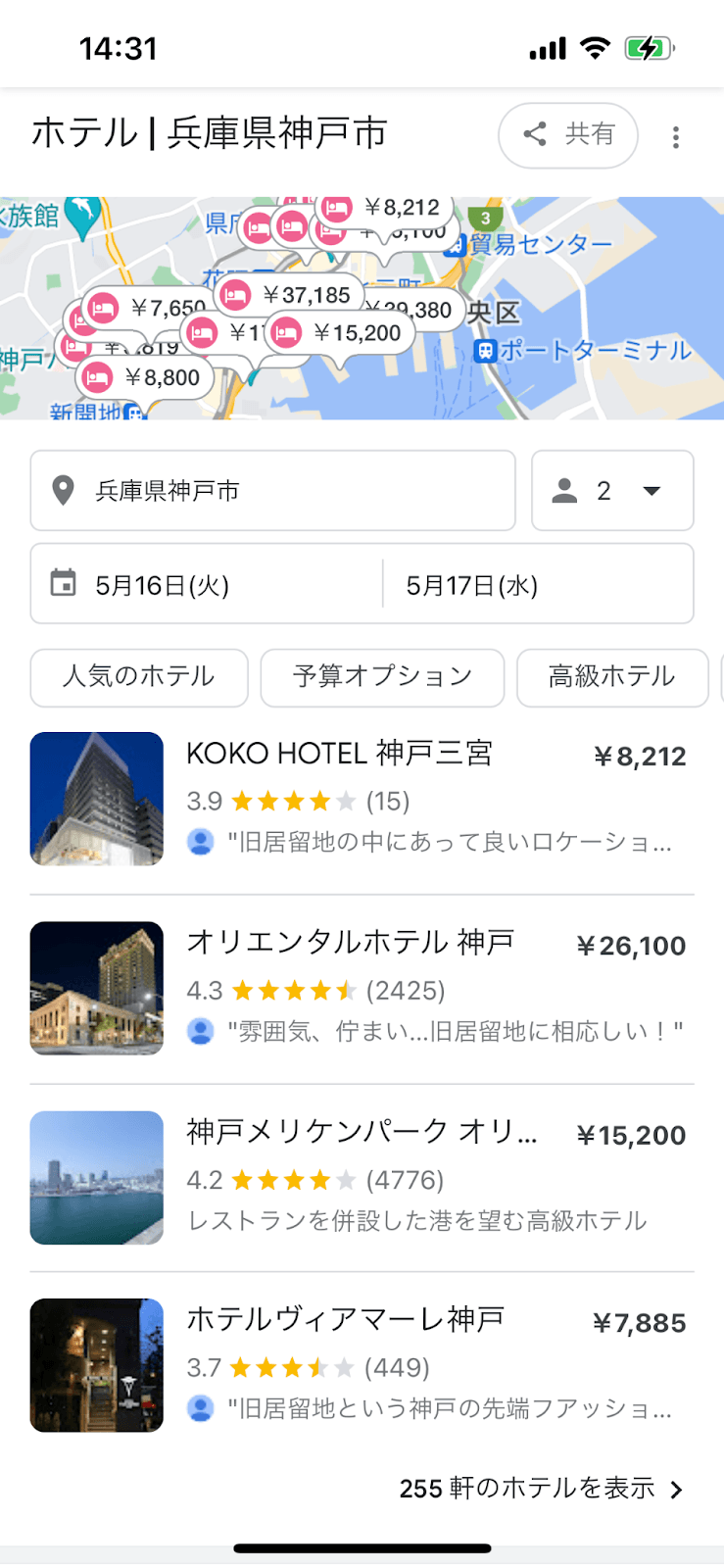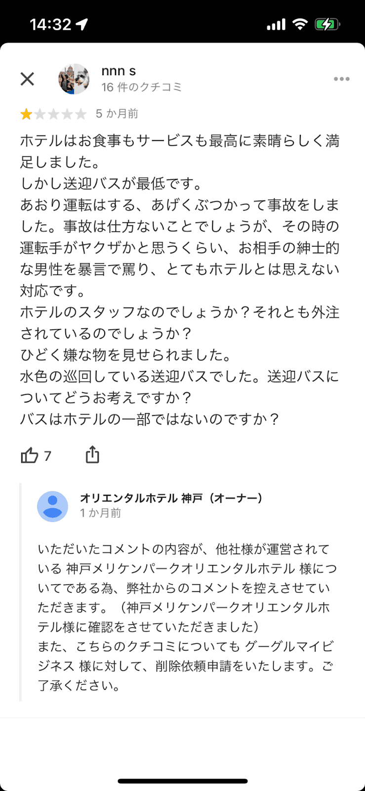 また、Googleビジネスプロフィールも管理されています。神戸旧居留地ホテルでGoogle検索すると、ホテルホームページや各社予約サイト、ホテル紹介記事より先にGoogleビジネスプロフィールが下記の写真例のように表示されます。また、Google Mapから開いた場合でも空室状況を確認することができます。さらに3つ目の写真ではコメントに対し返信を行い真摯に対応していることがわかります。このようなコメントが届いた際、もし何も返事をせず放置してしまっていたら、本当は自社のことではないのにも関わらず次にコメントを読む顧客達に悪い印象を与えてしまいます。適切に対応することによって、誤解を生むことなくホテルのイメージを傷つけることなく運営を行うことができます。PDS HOTELSさんはInstagramとビジネスプロフィール双方のSNSマーケティングをうまく行えていると言えます。