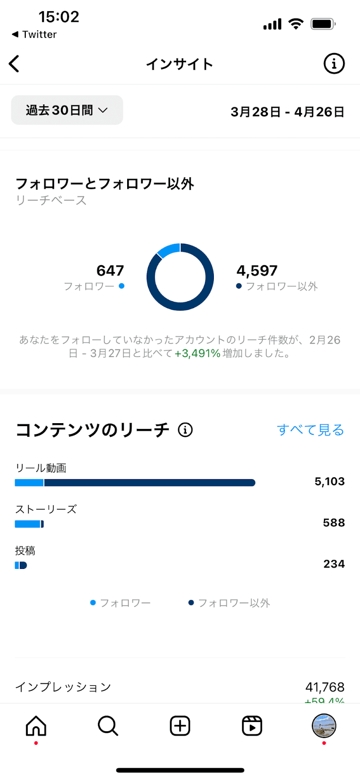 Instagramでは、自分のアカウントプロフィール画面からプロフェッショナルダッシュボードをクリックすることによってパフォーマンス効果を閲覧することができます。その後アカウントのインサイトをクリックします。以下の写真例では、リーチしたアカウント数に関する指標について確認しています。リール投稿からのリーチはフォロワー外からが多いことがわかります。この指標からは、より多くの人に周知したい場合はリール投稿を行い続けることが適切であるということが明らかになります。逆にストーリー投稿はほとんどの場合既存のフォロワーにリーチしている状況にあるので、より細かなことを伝える際に活用すると良いということがわかります。