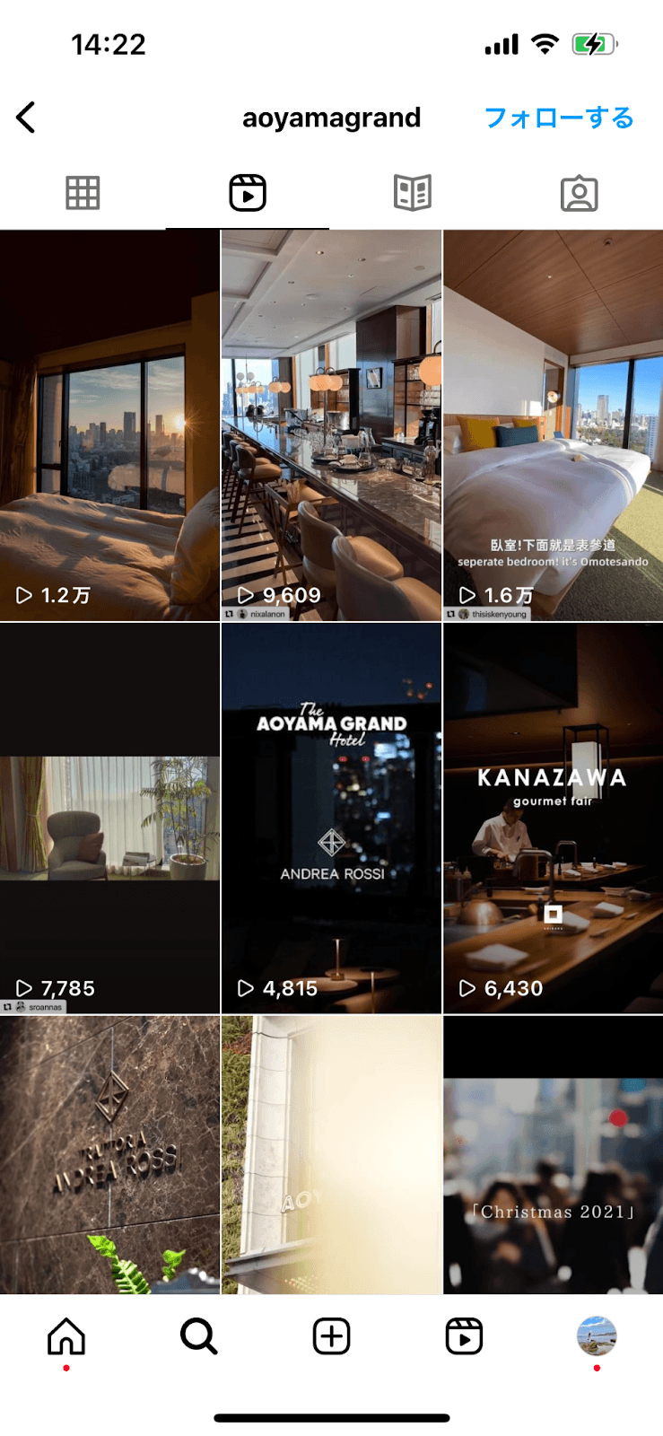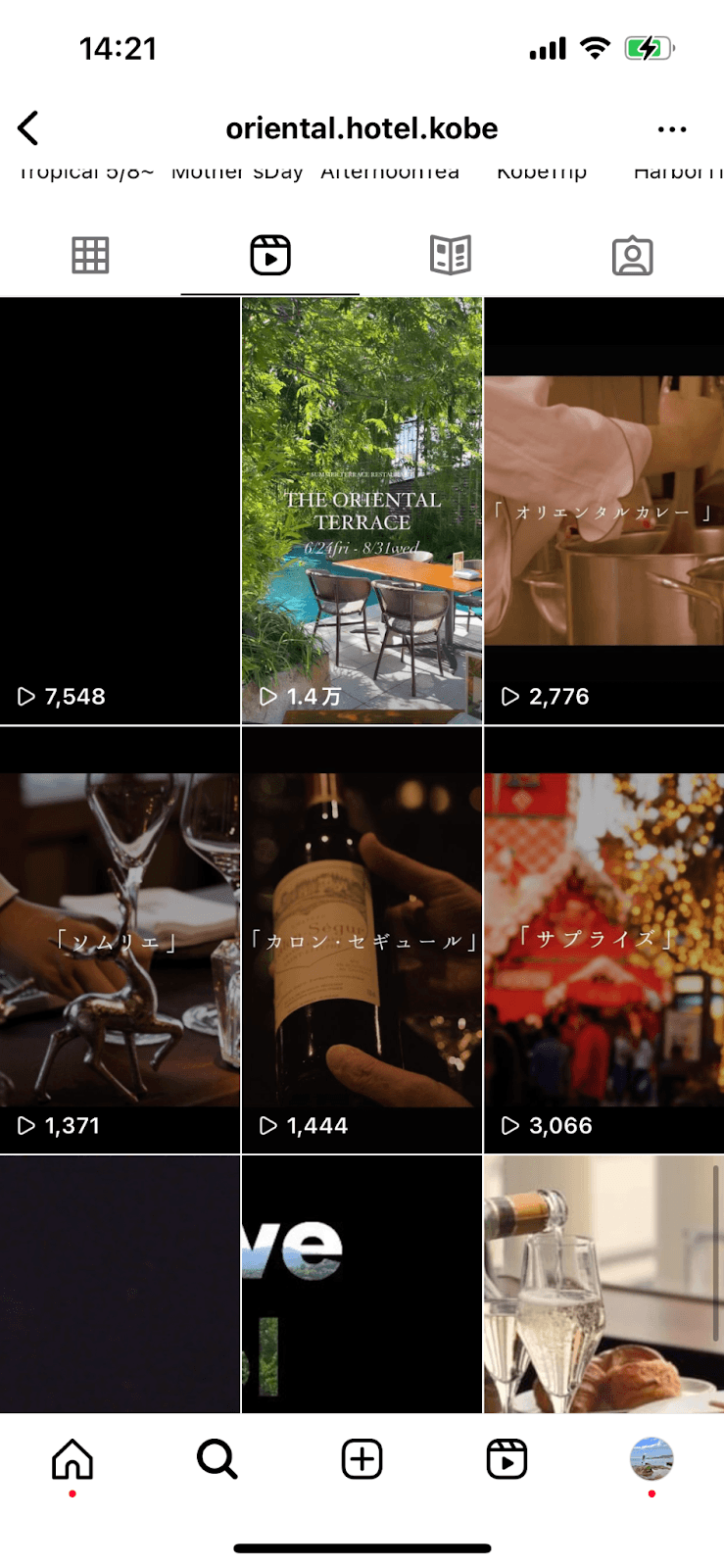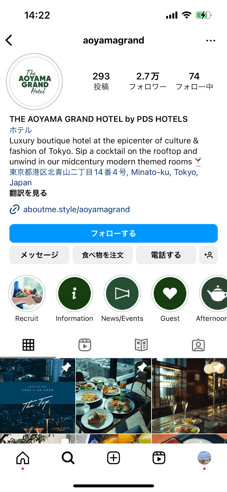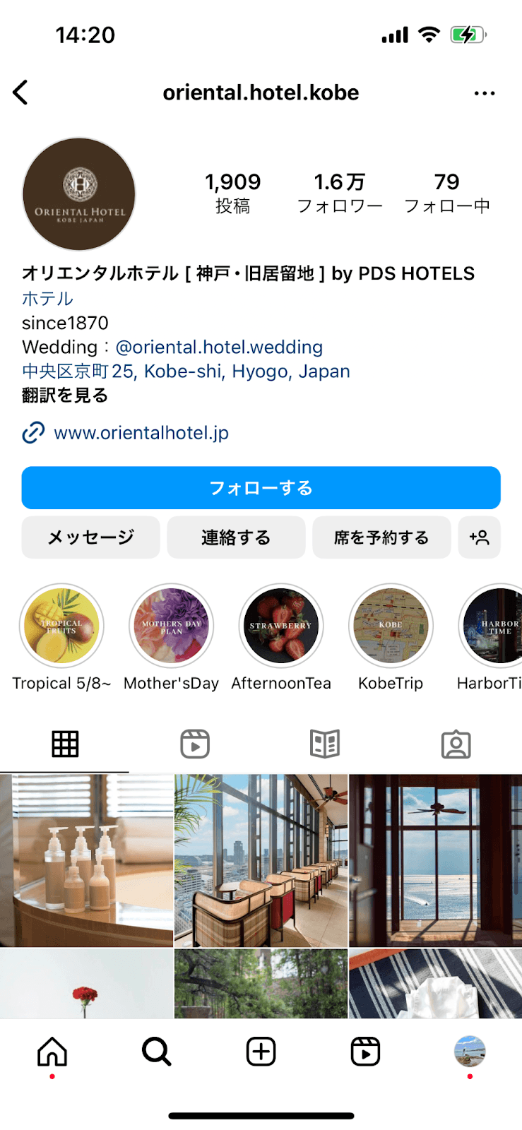 日本に7ホテル、ベトナムに1ホテルという多店舗を運営するPDS HOTELSさんの神戸と東京の店舗を例に見ていきます。店舗ごとにアカウントを作成し、3種類の投稿を使いわけさらにハイライトも活用されていることがわかります。