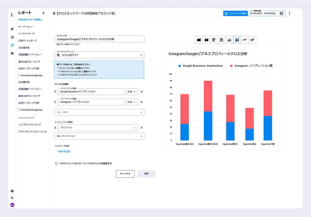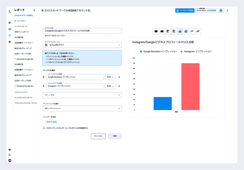 レポート開く→ブランクレポート作成→ウィジェット(データ単位)でメトリクスを見てみてください。Googleマイビジネス の分析指標と、Instagramの指標を同時に選択して見比べる事もできます。