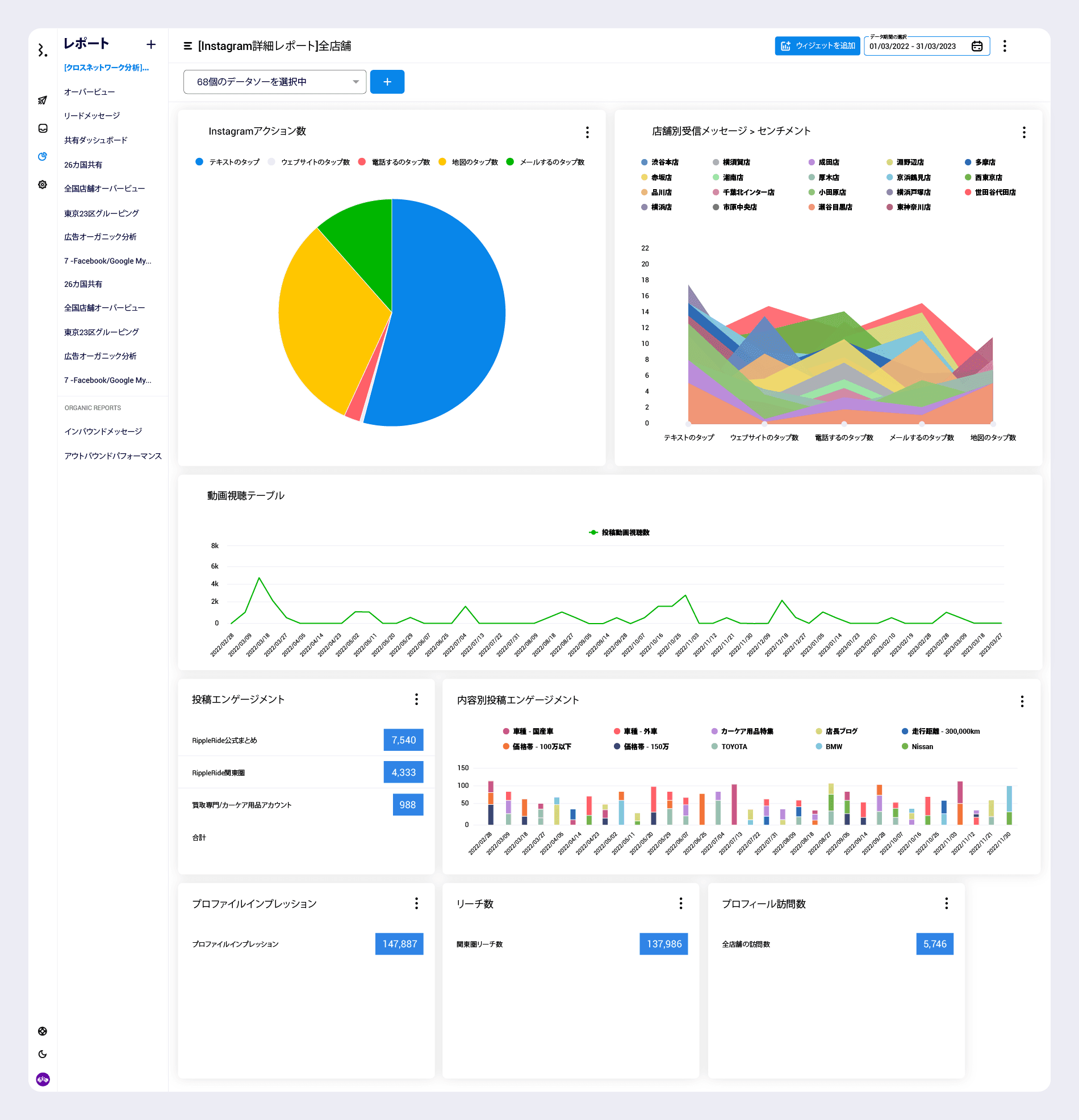 Instagramアカウントの店舗別のエンゲージメントやフォロワーの推移を確認したい。