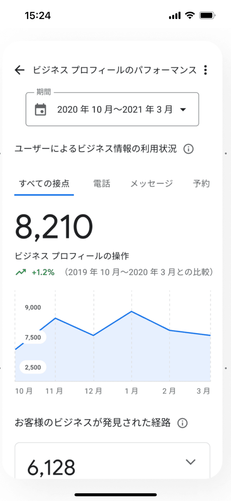 Google ビジネスプロフィールでもインサイトから投稿パフォーマンスを確認することができます。顧客がどのキーワードを使用し検索したか、電話問い合わせ、口コミなどに関する分析情報も取得することができます。