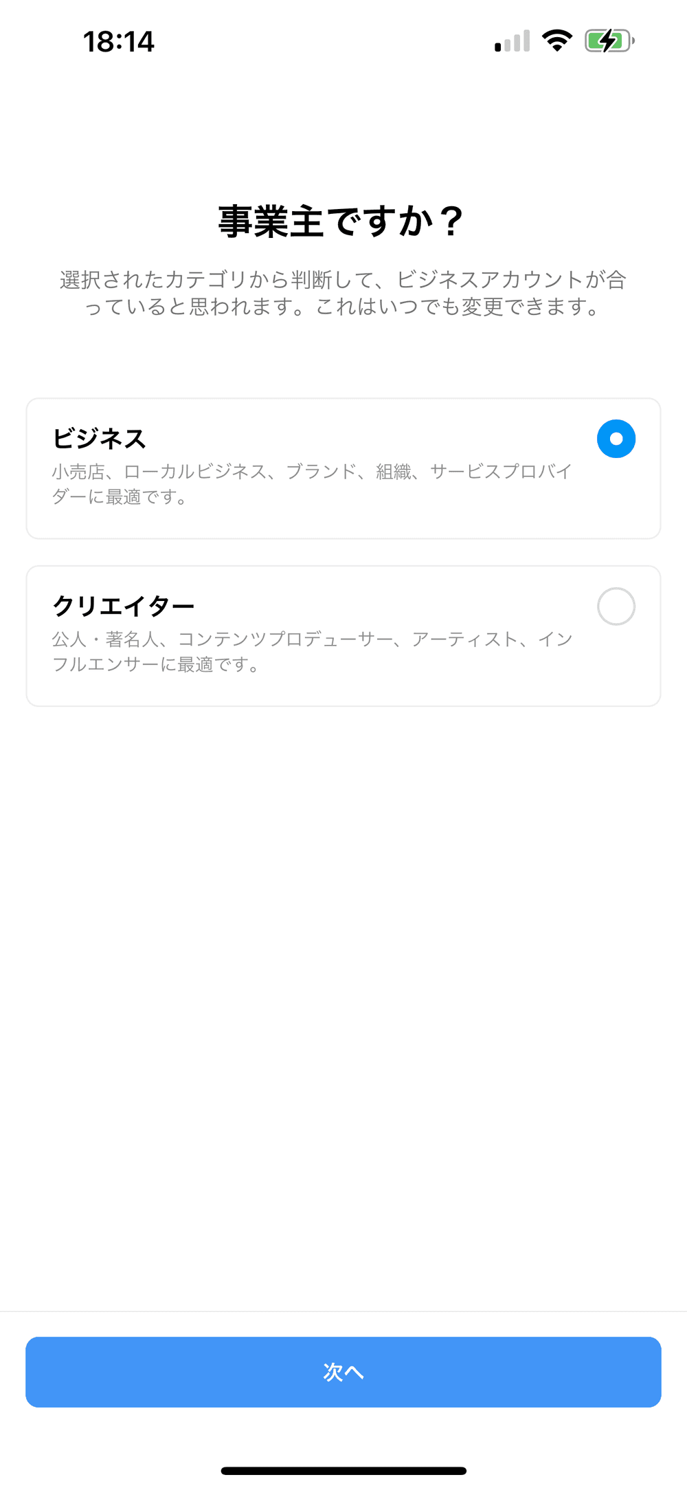 (3)先ほど設定したカテゴリーに基づいてアカウントタイプを推奨されますが、もしStatusbrewのようなサードパーティー製アプリケーションを利用したい場合は必ずビジネスを選びます。