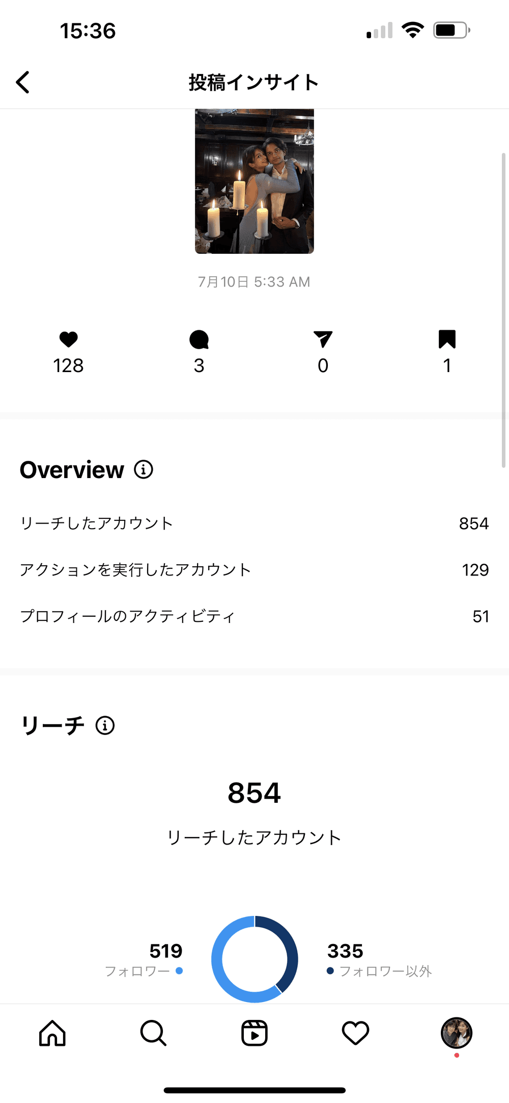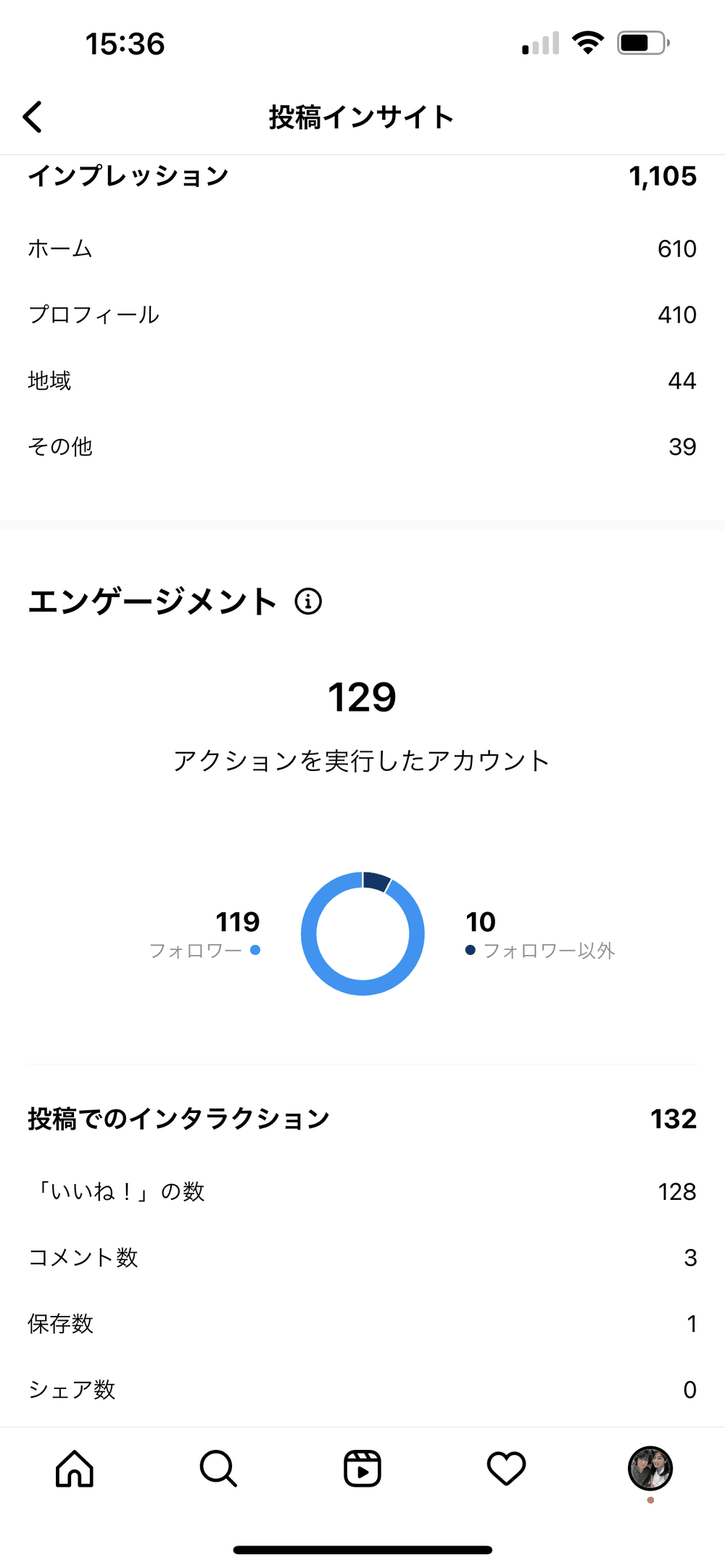ちなみにフィード、リール、IGTV、ストーリーズと種類ごとに確認ができます。