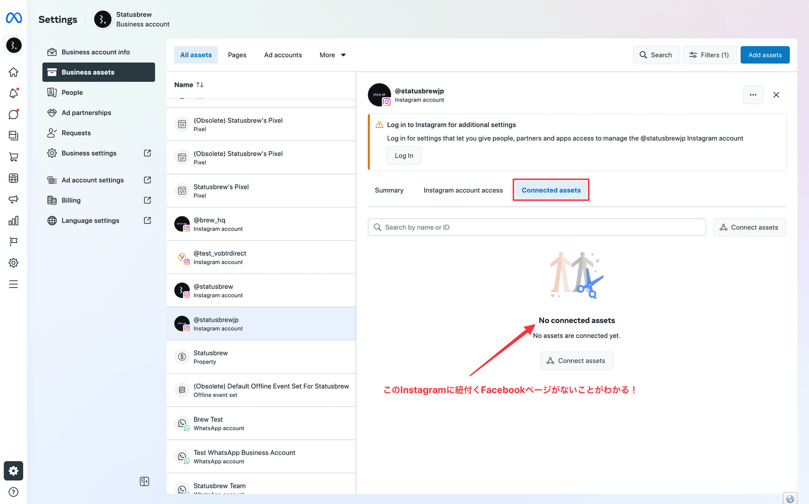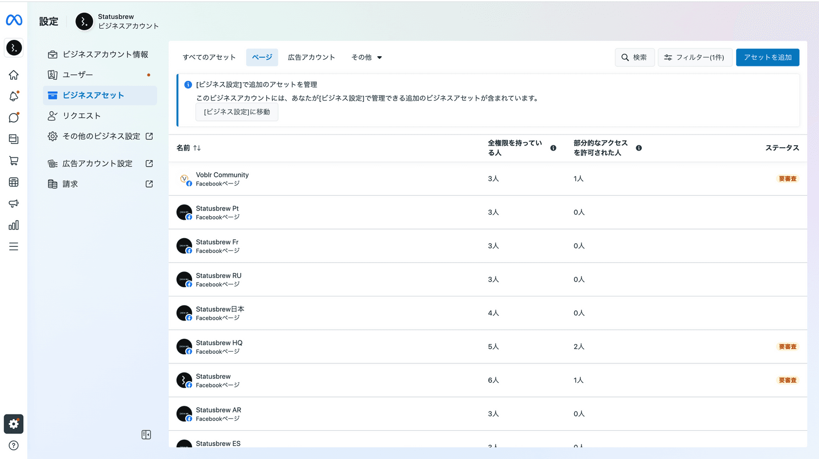 あなたとあなたのチームメンバーが、どの「アセット(=Instagram/Facebook/WhatsApp)」を所持していて、誰にアクセス権限があり、またきちんとFacebookページが紐づいているものかどうか?をタブの切り替えで一覧表示してくれる優れものです。