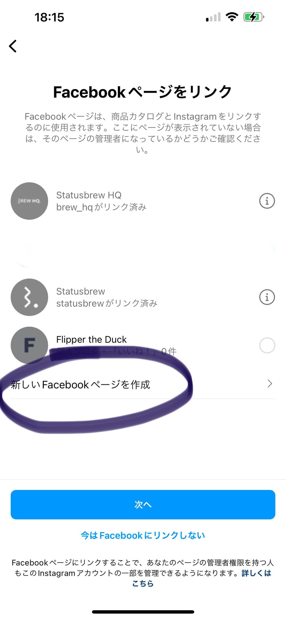 このインスタグラムアカウントに紐づくFacebookページを作成します。