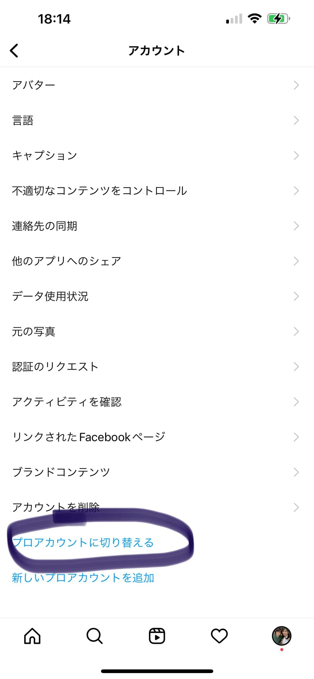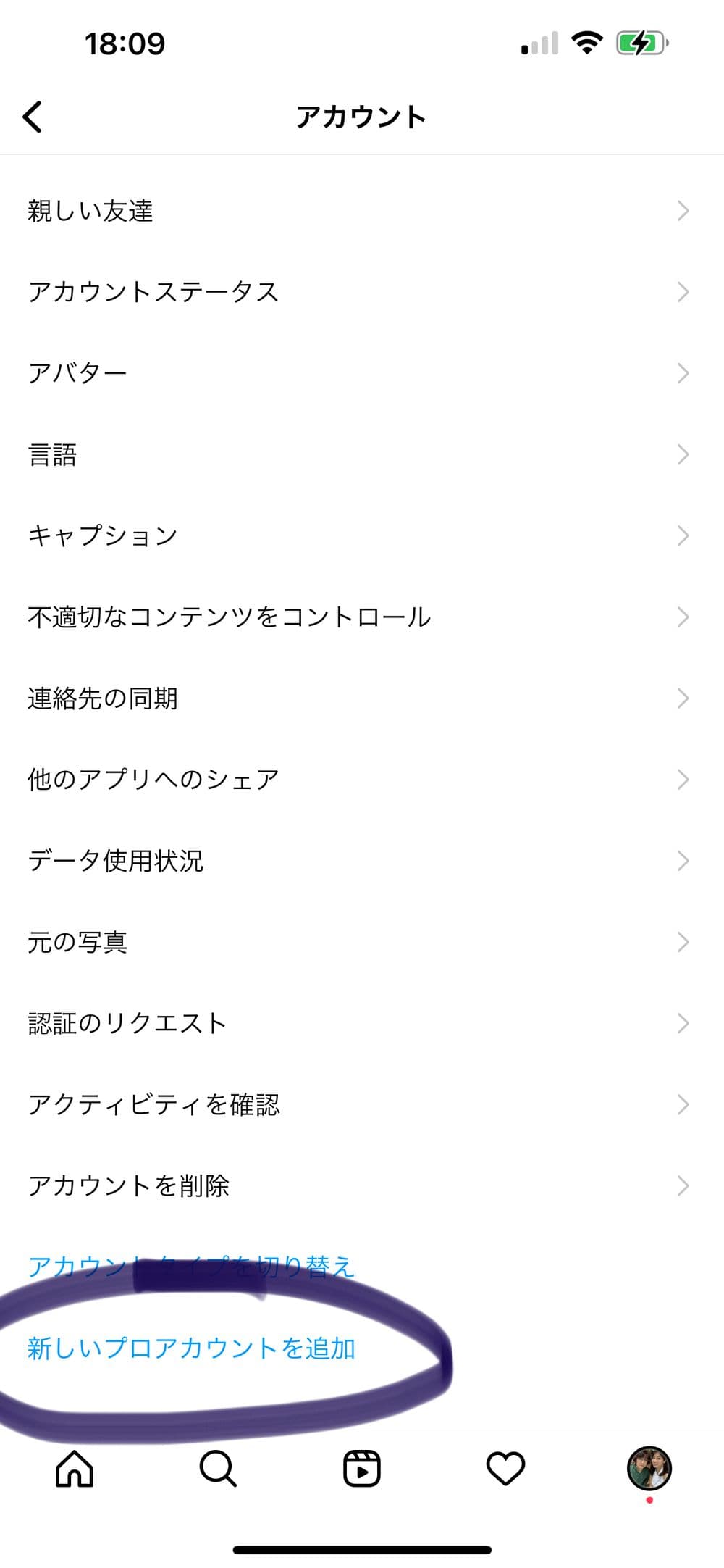 (3) 万が一、すでに[アカウントタイプを切り替える]もしくは[新しいプロアカウントを追加]という表示になっている場合は、あなたのアカウントがすでにビジネスプロファイル(プロアカウント)になっているという意味です。