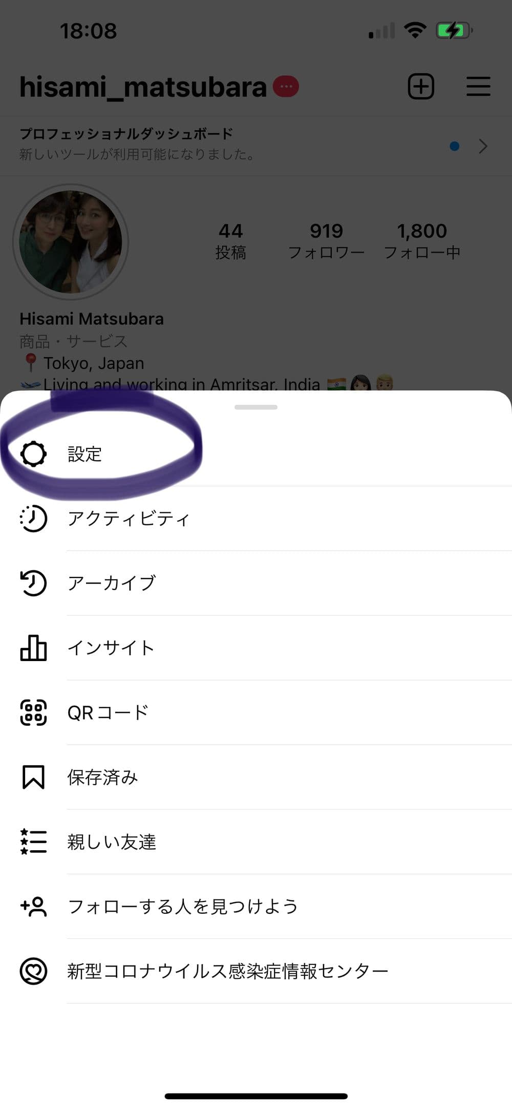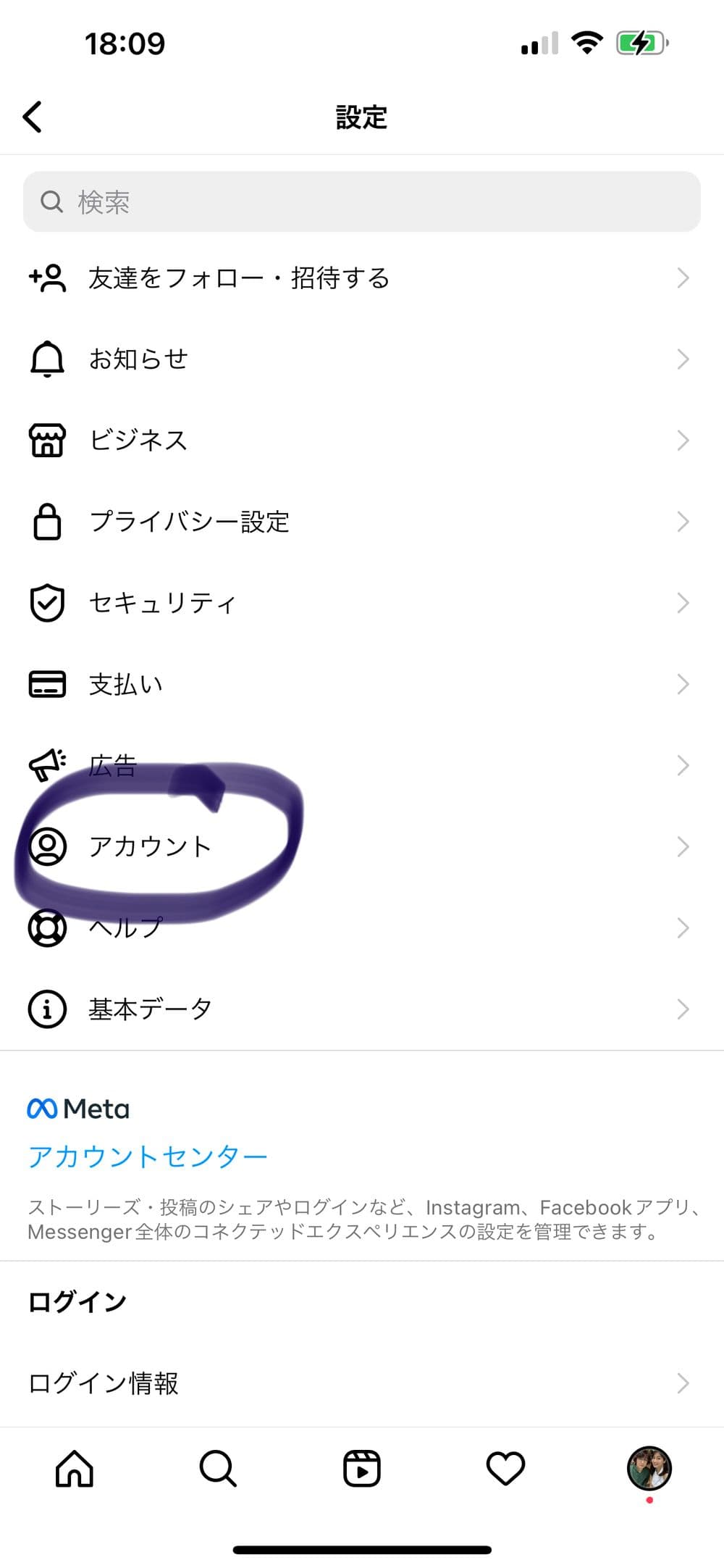 まずは、ご自身のインスタグラムがビジネスプロファイル(プロアカウント)になっているかどうかを確認します。