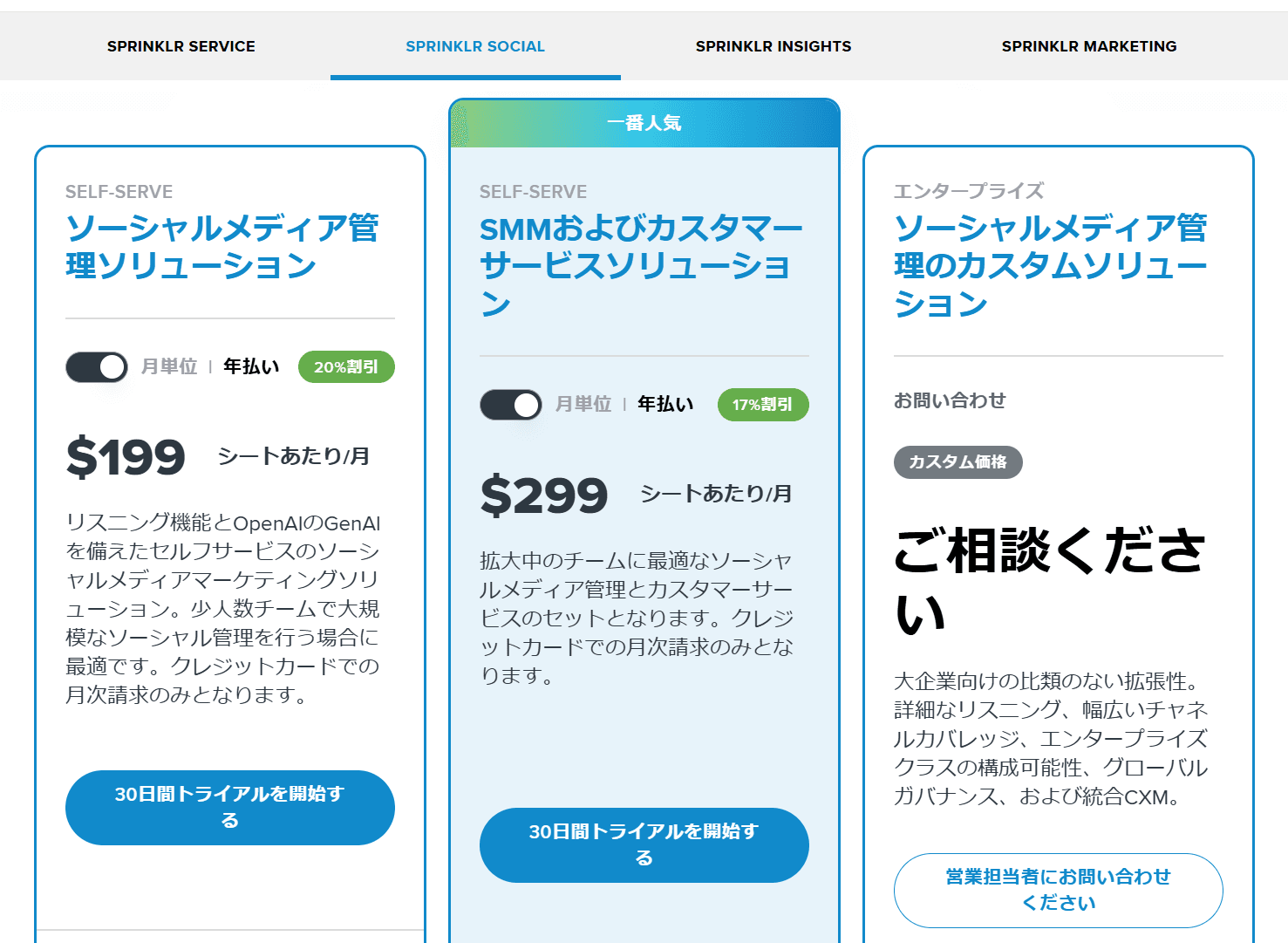 例えば、ソーシャルメディア管理機能があるSprinklr Socialだと、最低価格は$199(約29,850円)からとなりますが、あくまで1ユーザーあたりの価格となります。