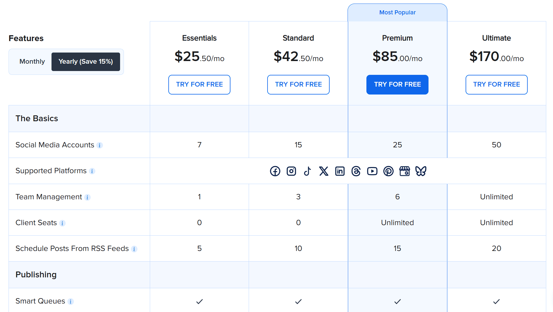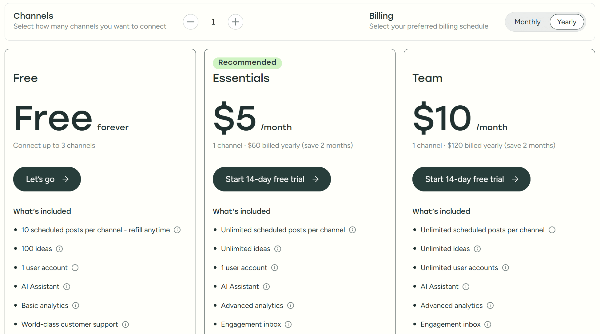 あくまで1ソーシャルアカウントでの価格で、Essentialsはユーザー数が1となりますが、非常にスタートしやすい価格設定です。