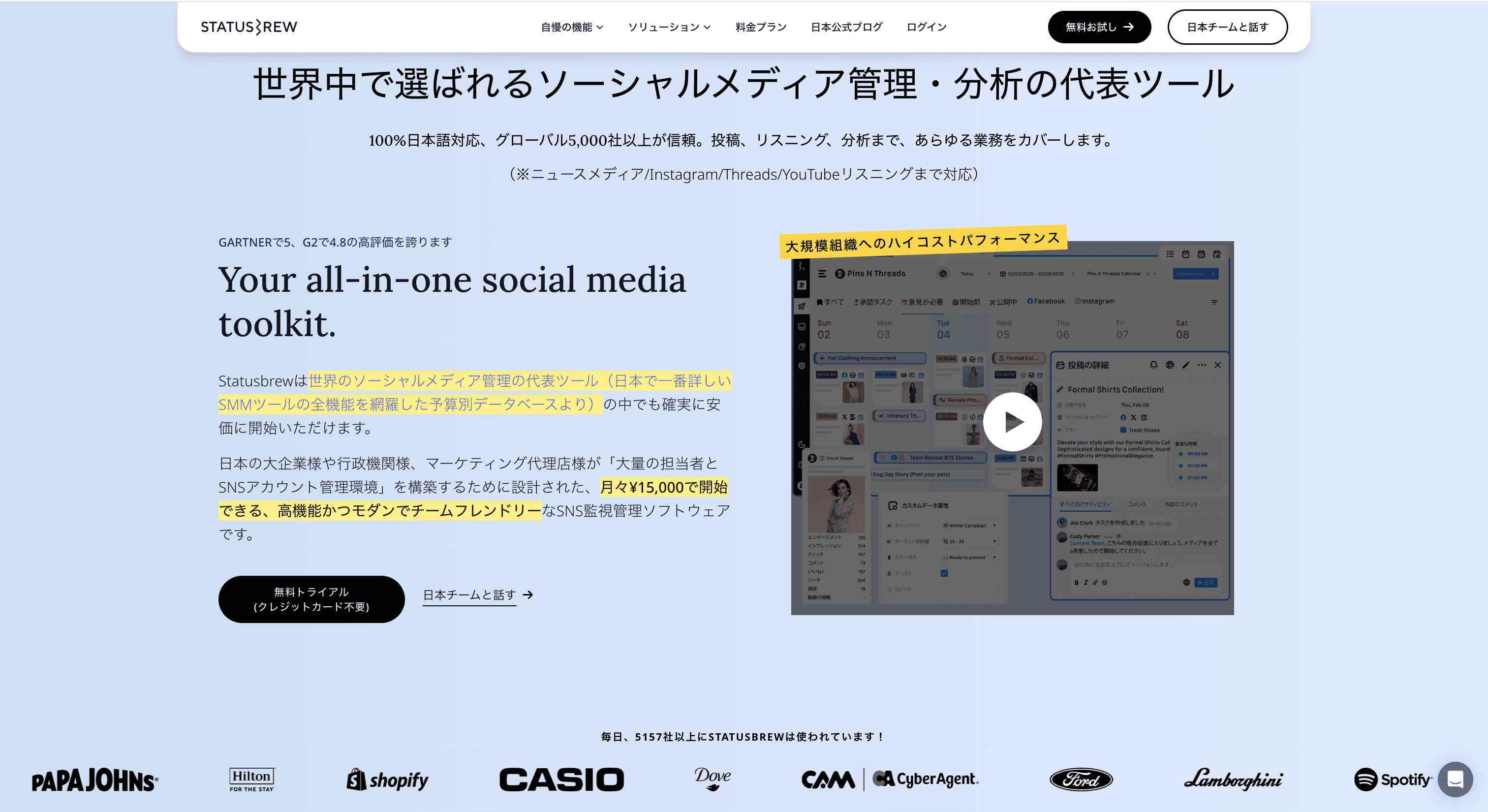 Statusbrewは、コンテンツ作成から自動予約投稿、エンゲージメント、ソーシャルリスニング、分析などの機能も持ったオールインワンツールです。