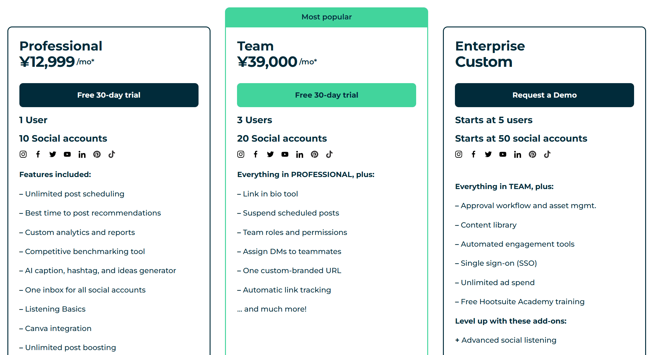 プランは3つあり、チーム規模によって最適なプランを選べますが、Enterpriseプラン(カスタム見積り)以外はユーザーやソーシャルアカウントの追加ができず、アカウント数やユーザーが増えるとEnterpriseプランへ移行せざるを得なくなります。