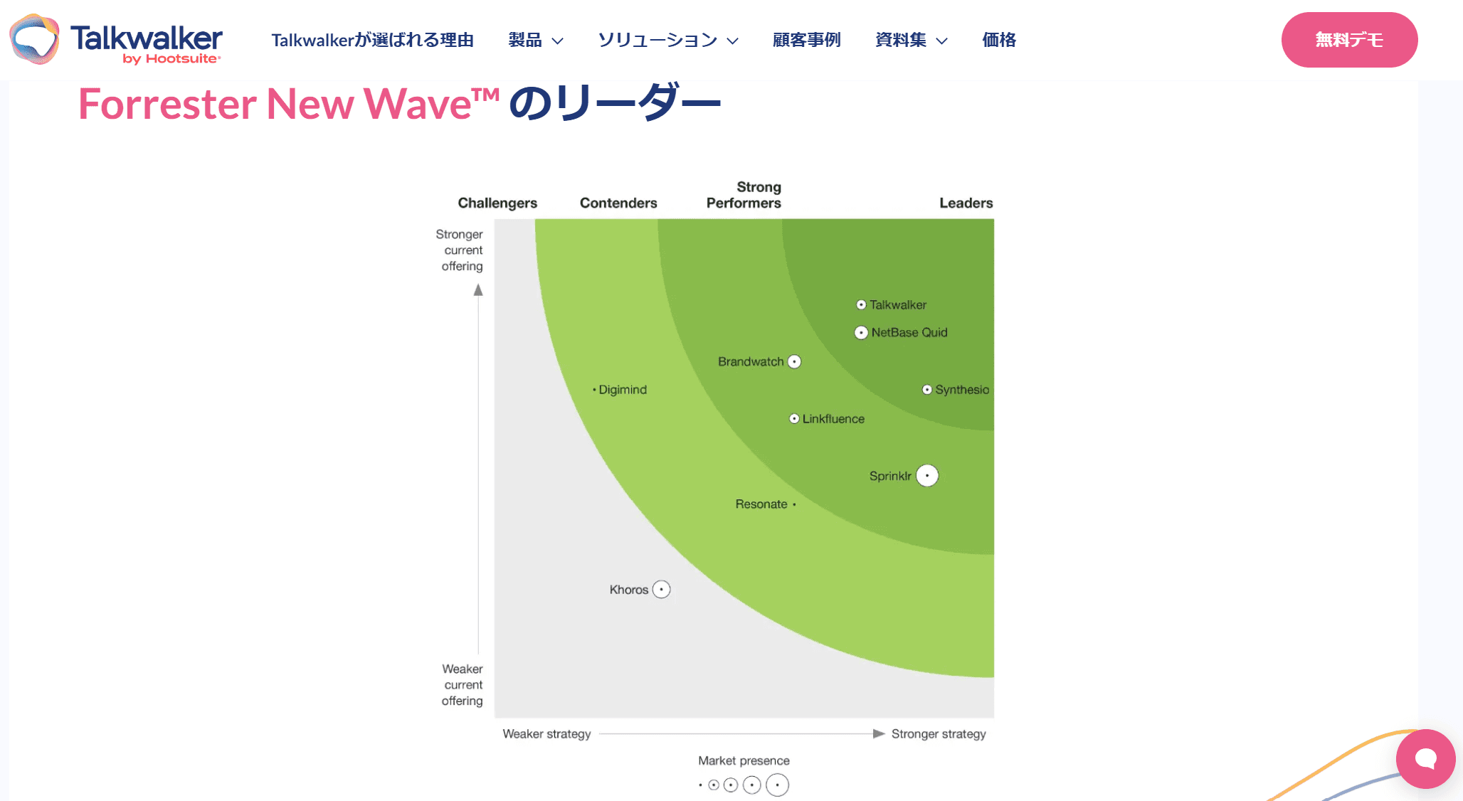 Talkwalkerはリアルタイムに顧客のインサイトを獲得することを掲げていて、Forrester New Wave™:AI-Enabled Consumer Intelligence Platforms, Q3 2021ではリーダーに選出されています。