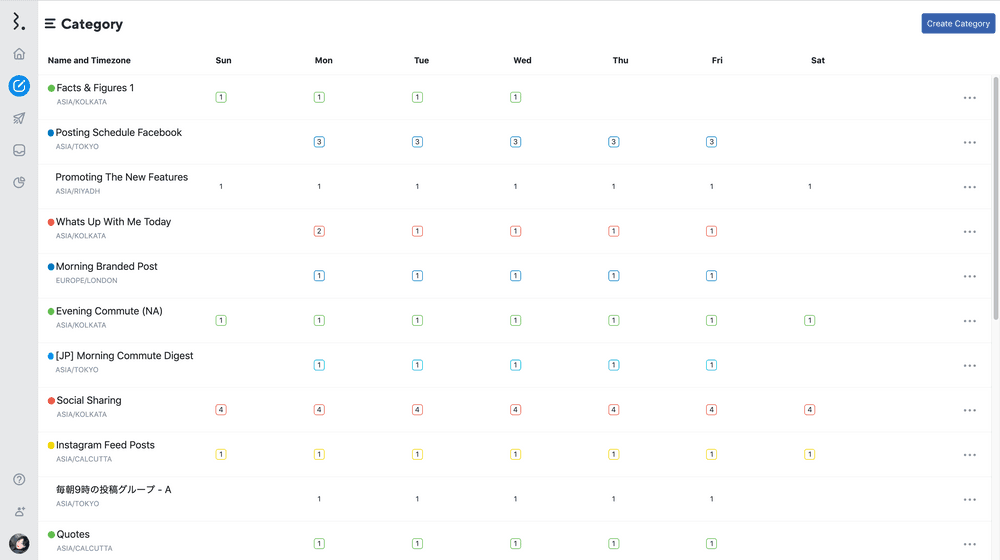 カテゴリーとはあらかじめタイムゾーンと投稿日時をセットアップする予定表のことです。カテゴリー投稿をすることで、投稿時間の設定だけではなく全体の予約バランスも俯瞰してみることができます。