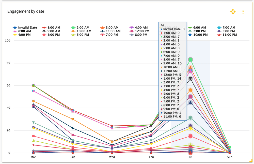 オーディエンスのアクティブ度が時間帯によるもの、つまり時間さえハマればエンゲージしてくれるのか、それとも時間帯だけが重要ではなくその投稿の内容との因果関係を導き出すことができます。