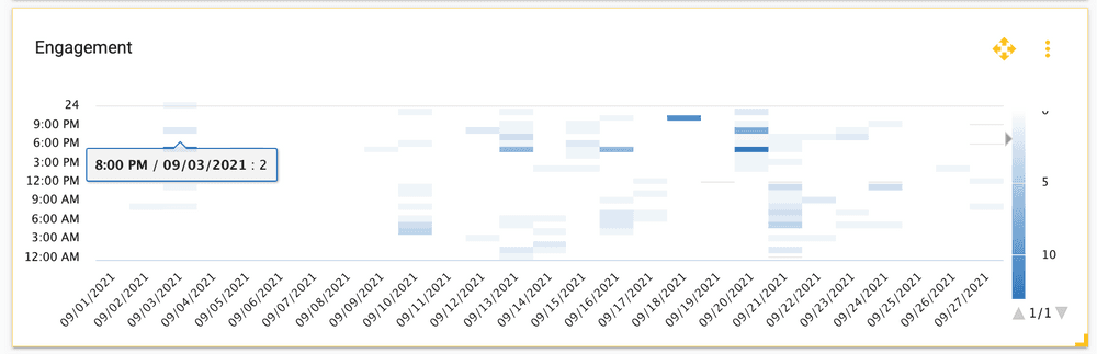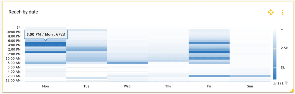 メトリクスやディメンション、フィルター機能だけではなく様々なビジュアライゼーションがありますが、時系列ヒートマップは、数値(この場合だとProfile Impressions)を色の強弱でつけることで表現し、さらにそれを時系列に並べることで、時間の経過に伴う変化を表しています。