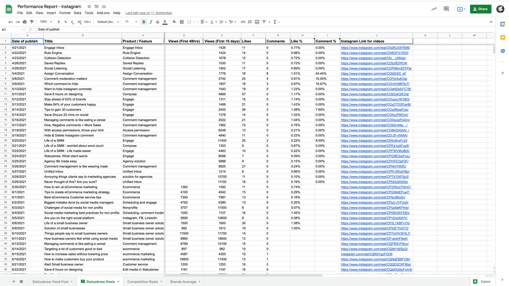 いいね!の数、コメント数、投稿した時間、ツイートの種類(リンク、画像、動画)などを記録して見てください。ちなみにこちら、TwitterではないですがInstagramの分析レポートを、私たちStatusbrewもスプレッドシートで例として作成して見ました。