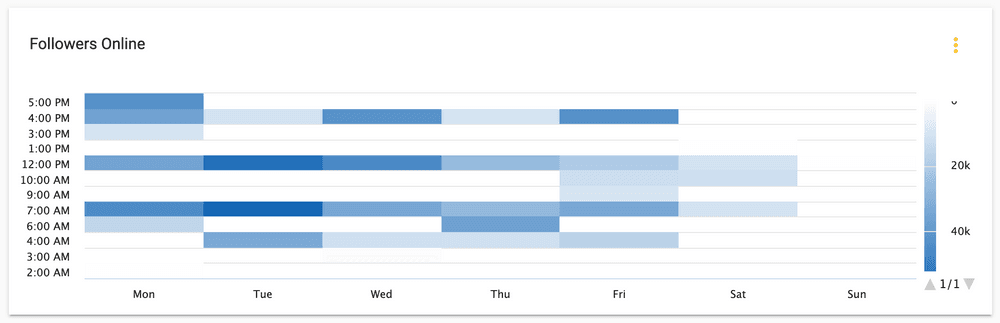 このデータ結果は、私たちStatusbrewの公式アカウント(@statusbrew)のものです。最も濃い青色の箇所、つまり火曜日の朝7:00時〜お昼12:00ごとがピークです。