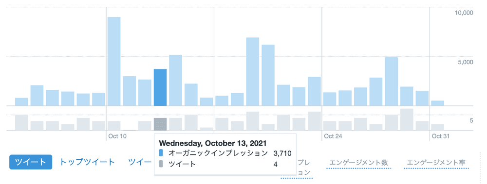 13日の時点では3,710と半数以上を獲得した可能性が高く、その翌日では5,174とよりインプレッションが引き継がれているのがわかります。ちなみに私はこの13日の前後はほとんどツイートしていません。ここで注意しなければならないのが、現在のネイティブアナリティクスでは、特定のツイートごとのインプレッションの獲得期間、持ち具合は表示できなくなっています。