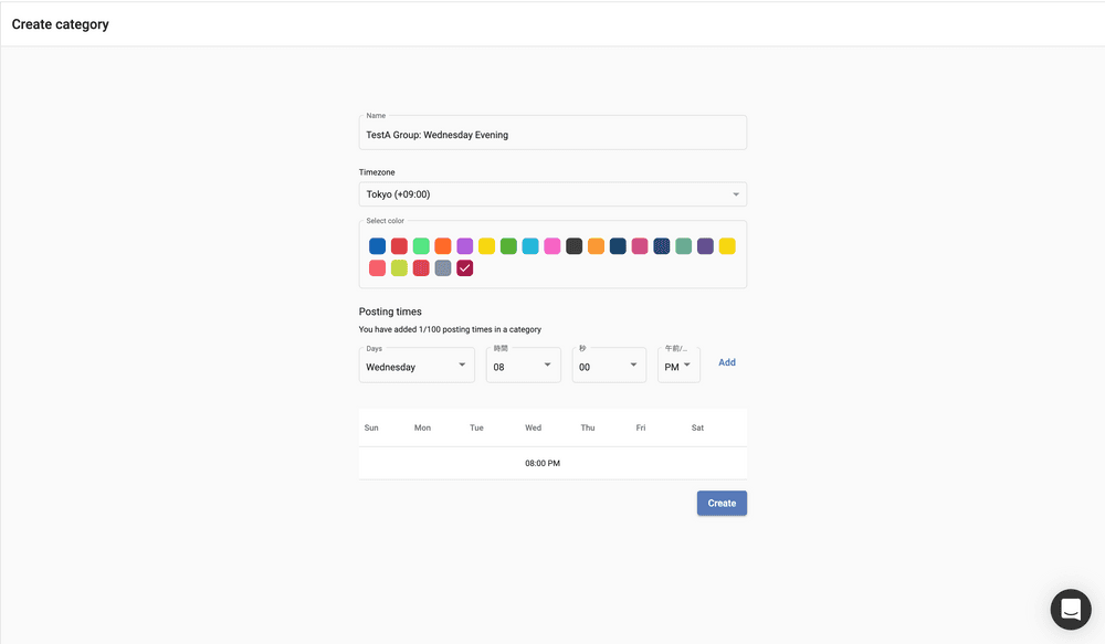 カテゴリー名、タイムゾーン(日本のユーザー向けの場合はTokyoにする)、投稿時間を決めてカテゴリーを作成します。