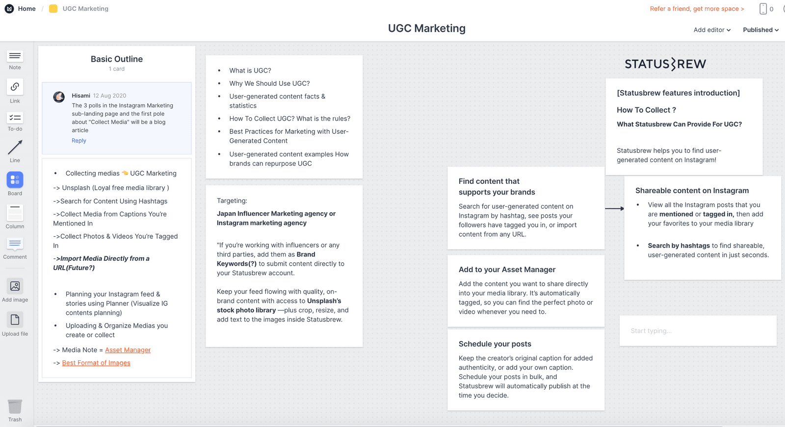 私たちStatusbrewは例えばランディングページやブログプラットフォームのアイディアを新たに出したいときに、Milanoteというアプリケーションを使って、箇条書き文章ではまとまらないアイディアをダッシュボードにノート化したりメモを載せて、矢印で整理したりするためにも使っています。