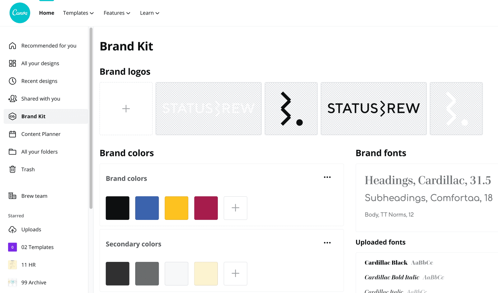 もしブランドカラーやロゴが独自にすでにある場合は、Canvaのブランドキット機能も同時に使いましょう。一度登録しておくとどのコンテンツにも反映できます。これは私たちStatusbrewのロゴやデザイナーが決めたブランドカラーです。